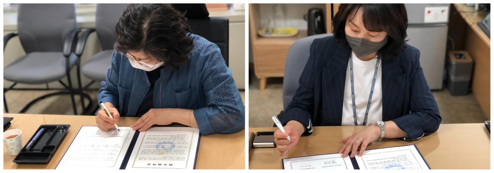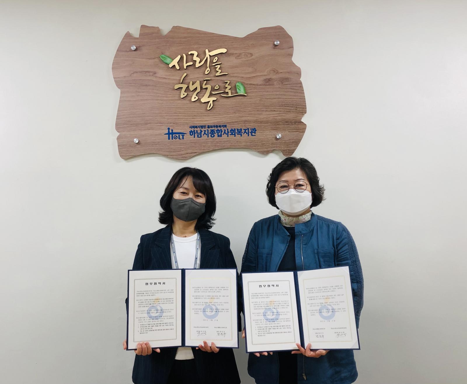 하남시청소년상담복지센터와 업무협약(MOU) 체결 작성일 : 2022.09.27 | 조회수 : 6910 2022년 9월 27일(화)하남시종합사회복지관은 하남시청소년상담복지센터와위기아동·청소년의 건강한 성장 및 복지증진을 위하여상호협력 업무협약을 맺었습니다. 협약을 기반으로하남시 지역 내 위기청소년 조기발견 및 개입 체계구축을 위해적극적으로 협력하고,청소년들이 건강한 사회구성원으로 성장할 수 있도록 지원하겠습니다.