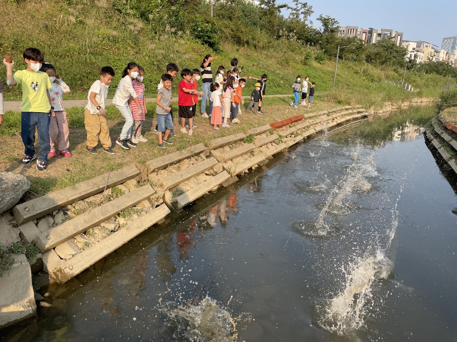 망월천이 깨끗해지길 바라며 흙공을 열심히 던지고