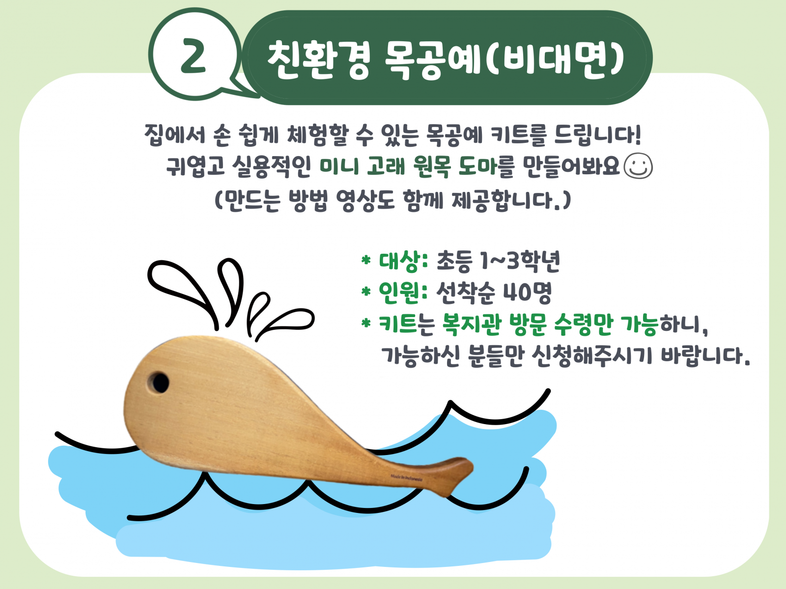 친환경 목공예는 초등학교 1~3학년 친구들을 대상으로 비대면으로 진행된 프로그램이에요!