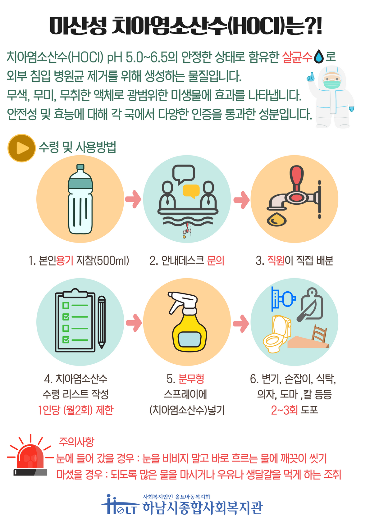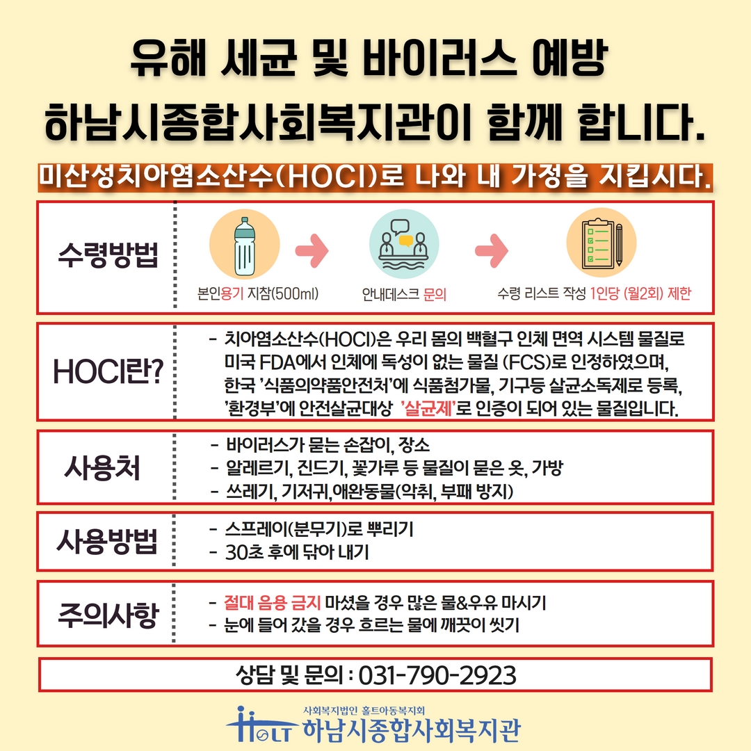 유해 세균 및 바이러스 예방 소독수 배분 작성일 : 2022.10.25 | 조회수 : 6658 하남시종합사회복지관에서 2022년 10월 25일 부터, 유해 세균 및 바이러스 예방을 위해 소독수를 매일 [무료]로 1일 10명(500ML) 배분합니다. ( 1인당 매월 2회 제한되며, 본인 용기 필히 지참 )배분을 원하시는 지역주민께서는 본인 용기 지참 하셔서, 1층 안내데스크에 문의 부탁드립니다. (절대 음용 금지)