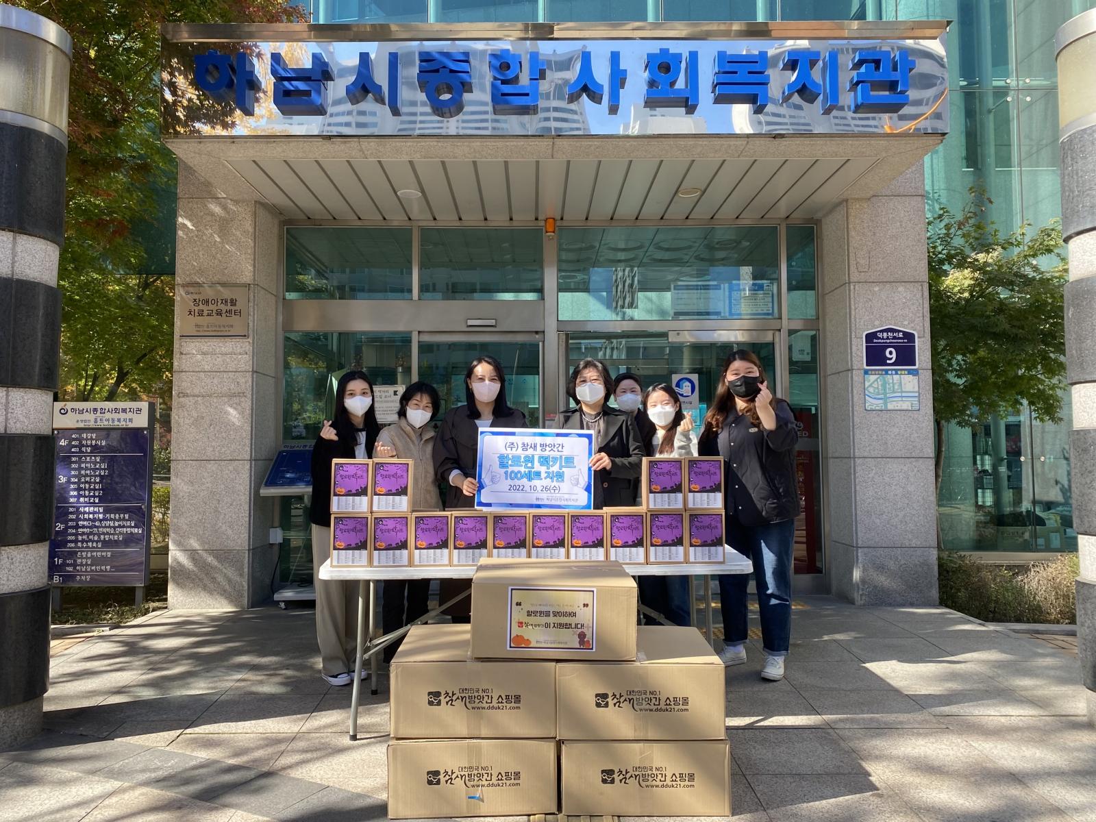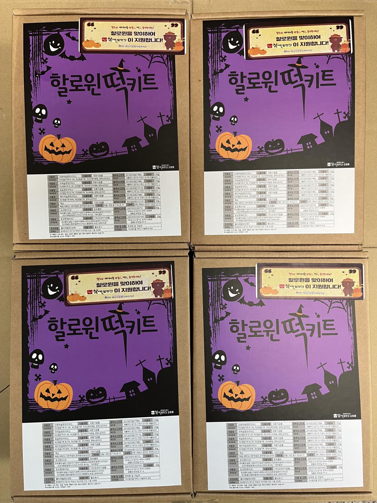 (주)참새방앗간 할로윈 떡 키트 후원 작성일 : 2022.10.27 | 조회수 : 7241 할로윈을 맞이하여 (주)참새방앗간에서 할로윈 떡 키트 100세트를 후원해주셨습니다.할로윈 떡 키트는 하남시종합사회복지관의 교육문화 프로그램 수강생, 치료실 이용자를 포함한100명의 관내 아동에게 전달하였습니다.아이들에게 즐거운 할로윈을 선물해주신 (주)참새방앗간에 감사드립니다 : )
