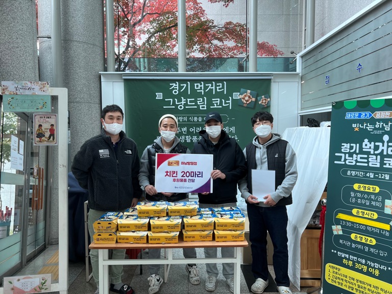 BBQ하남망월점 후원물품 전달 작성일 : 2022.11.03 | 조회수 : 6354 금일 BBQ치킨 하남망월점에서 지난달에 이어 치킨 20마리를 후원해주셨습니다.금번에는 치킨을 직접 소분하여 지역사회 어르신들께 후원해주신사장님들의 따뜻한 마음을 담아 모두 전달하였습니다. 감사합니다.