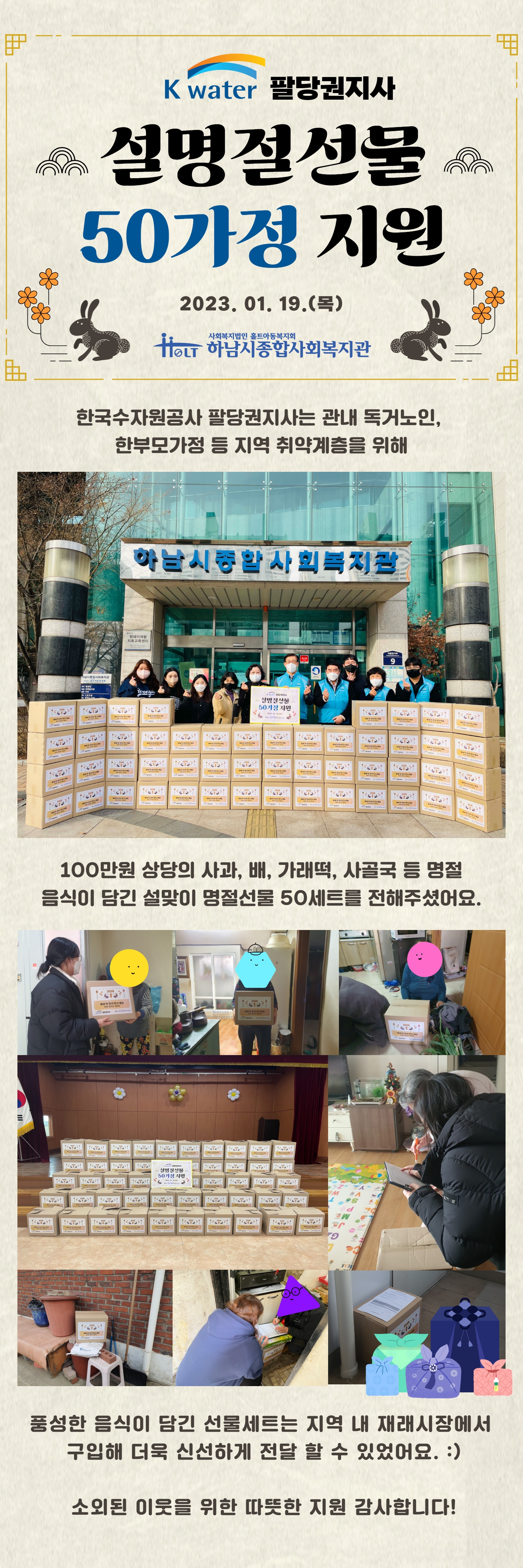 푸주옥 설렁탕 전달 2023-01-20 조회수 5,283 설명절선물 지원 릴레이 2023-01-20 조회수 5,994 K-water 팔당권지사 설 명절 선물 전달 2023-01-19 조회수 6,071 한국건강관리협회 건강증진의원 서울강남지부 설명절선물 지원 2023-01-18 조회수 6,143 한국전력공사 동서울전력지사 설명절선물 지원 2023-01-18 조회수 5,363 사랑의 경량 리어카 지원사업 2023-01-12 조회수 6,621 영화로 만나는 인권교육 2023-01-12 조회수 6,674 청장년 1인 가구 밥상지원 '같이혼밥' 4기 2023-01-09 조회수 5,526 꿈과희망지원사업 꿈 공모전 시상식 참여 2023-01-06 조회수 5,864