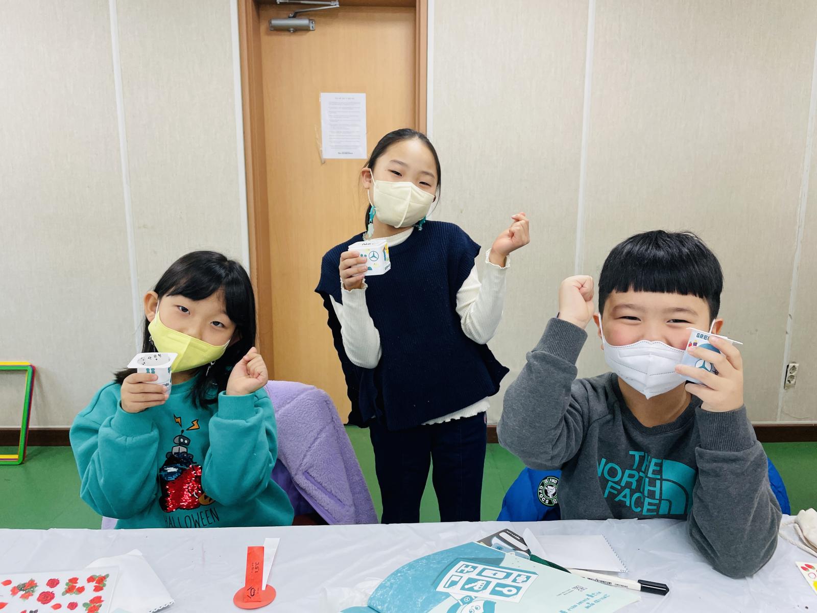친구들 손에 예쁘게 꾸며진 요플레 통이 들려있네요!