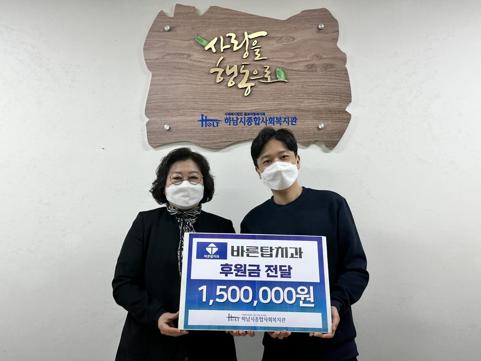 바른탑치과 하남점 후원금 전달 작성일 : 2022.12.14 | 조회수 : 5296 바른탑치과 하남점에서 12월 14일 방문하여 후원금을 전달해주셨습니다.매년 후원해주시는 장진규 원장은 “더 많은 도움이 드리고 싶다. 지역사회 나눔 실천에 동반하고 싶다.”라고 전해주셨습니다.전해주신 후원금은 지역사회를 위해 소중히 사용하겠습니다. 감사합니다.