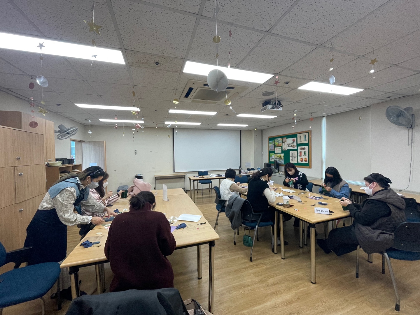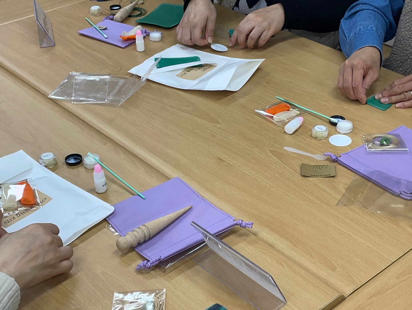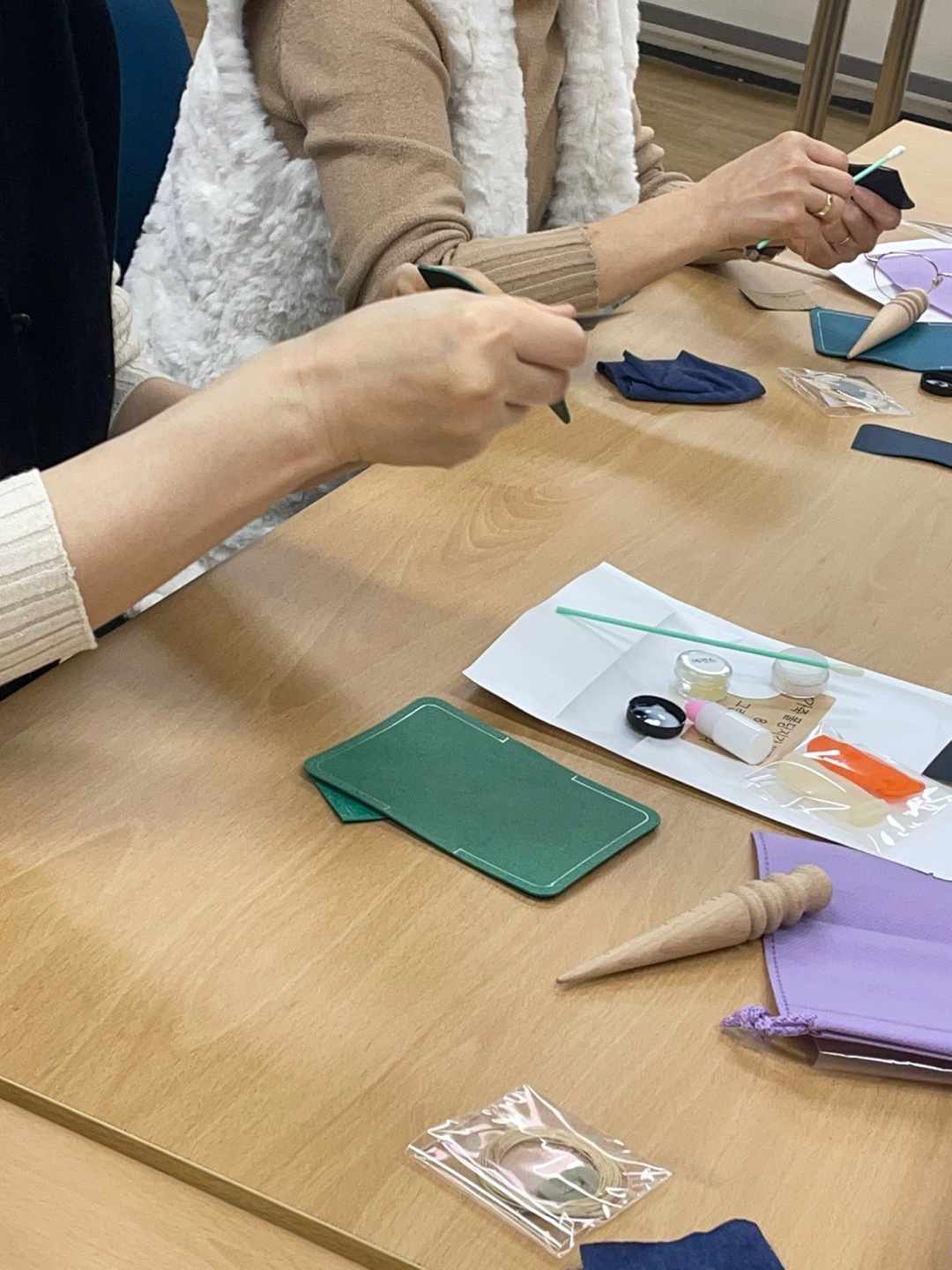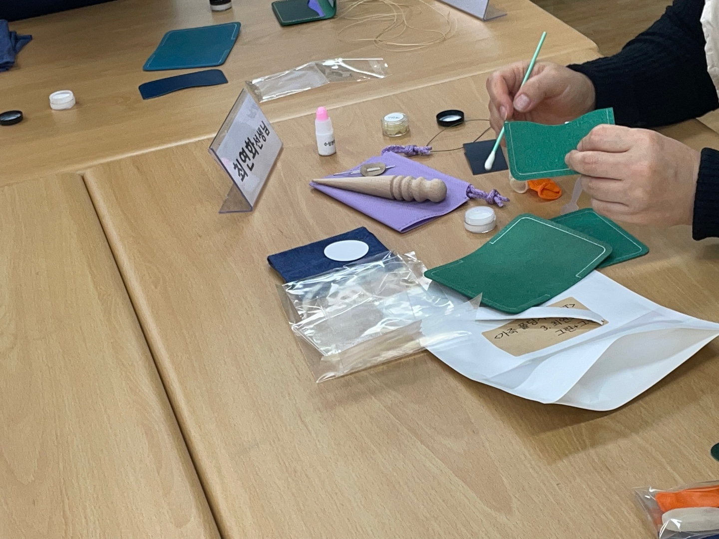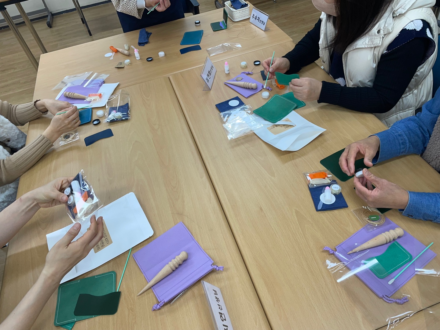 프로그램 시작 후, 선생님들과 함께 둘러 앉아 나만의 가죽공예품(카드지갑, 명함지갑)을 만들기 시작했습니다.