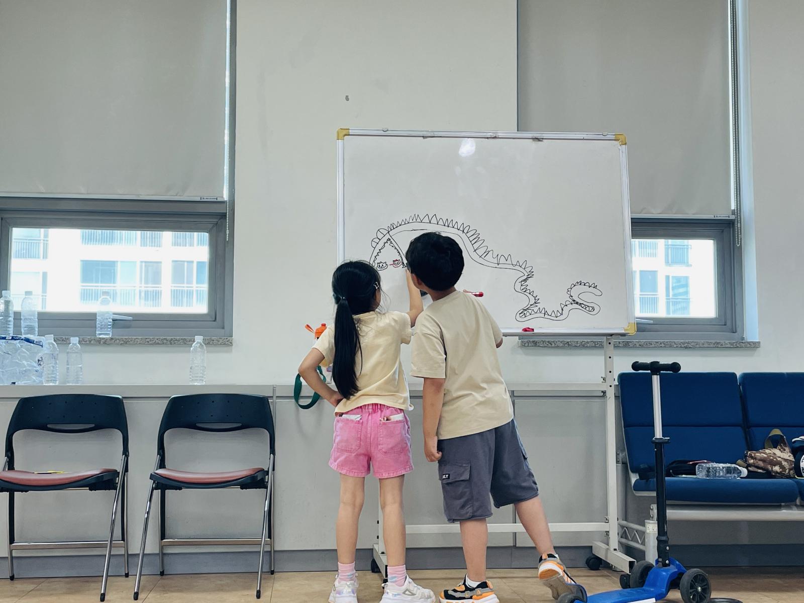 두 친구가 힘을 합쳐 그림을 그리니 크~고 멋진 용이 완성되었어요!