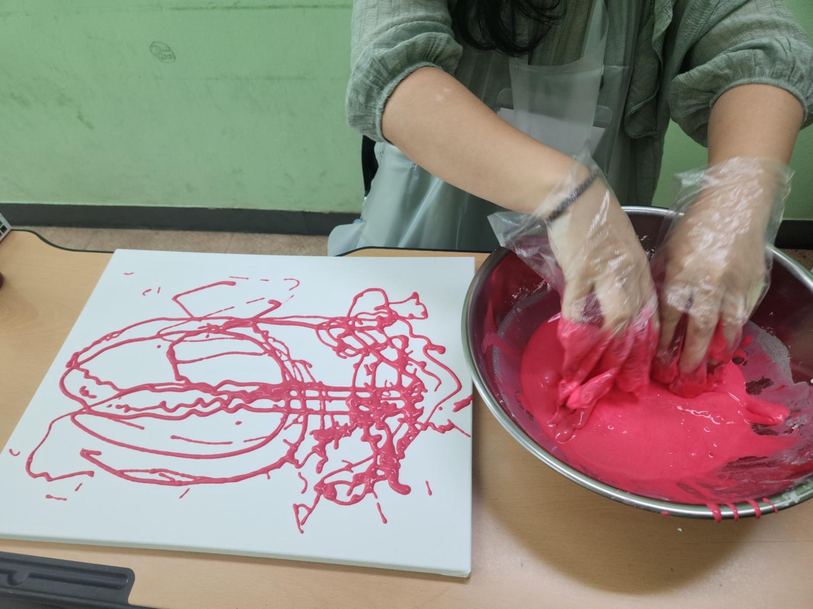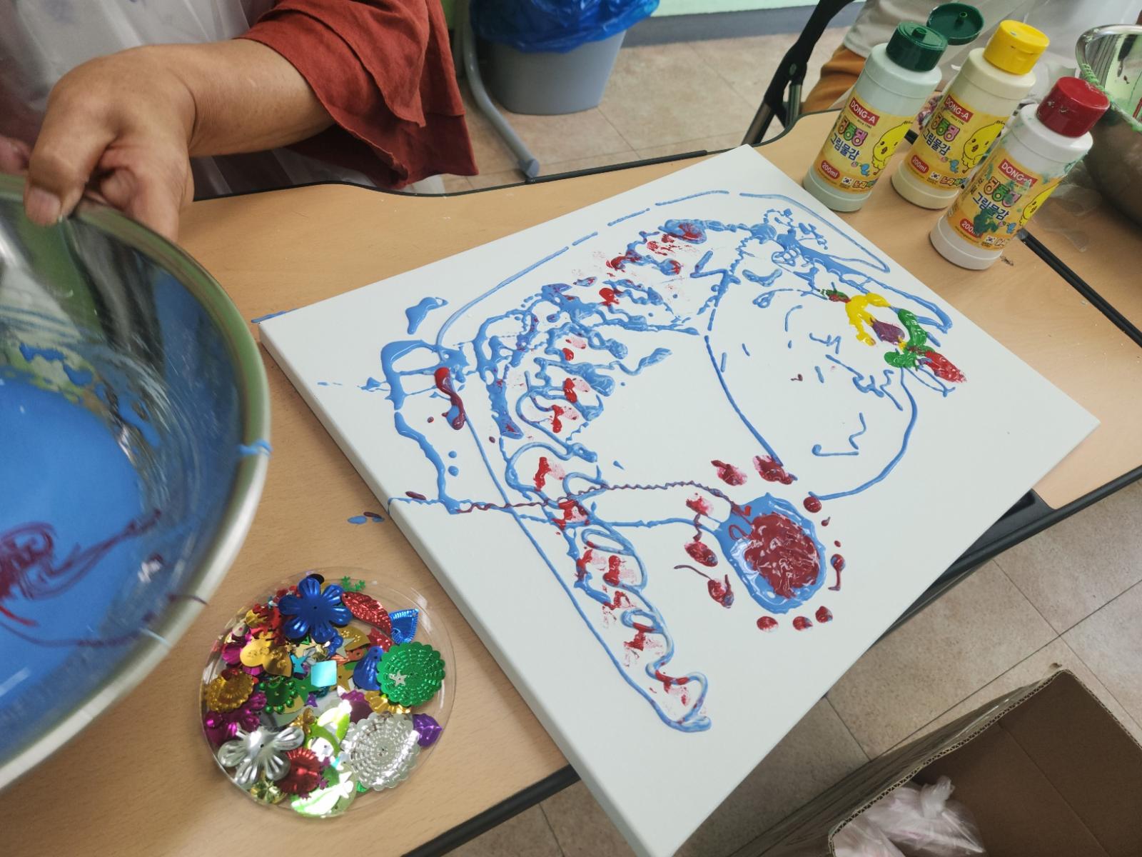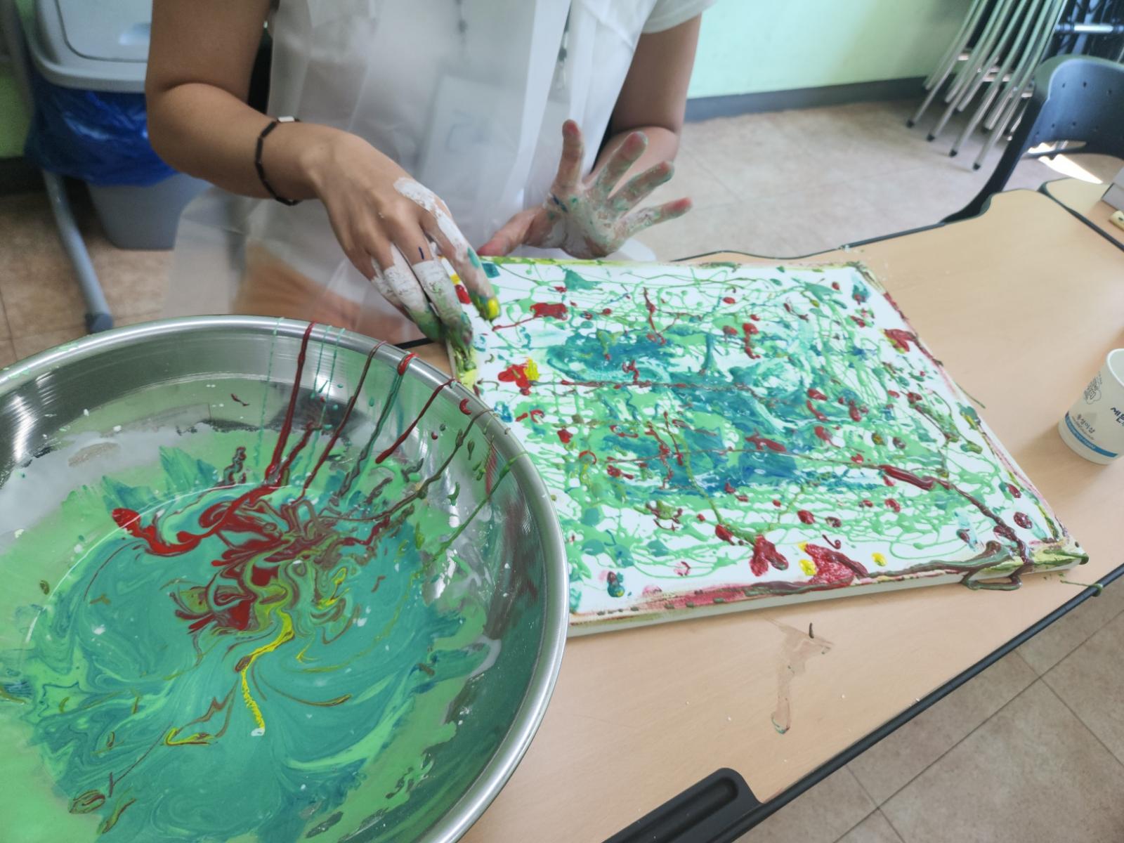 캠바스에 뿌려지는 전분 물감 그림을 보며 우연하게 표현되는 기법을 통해