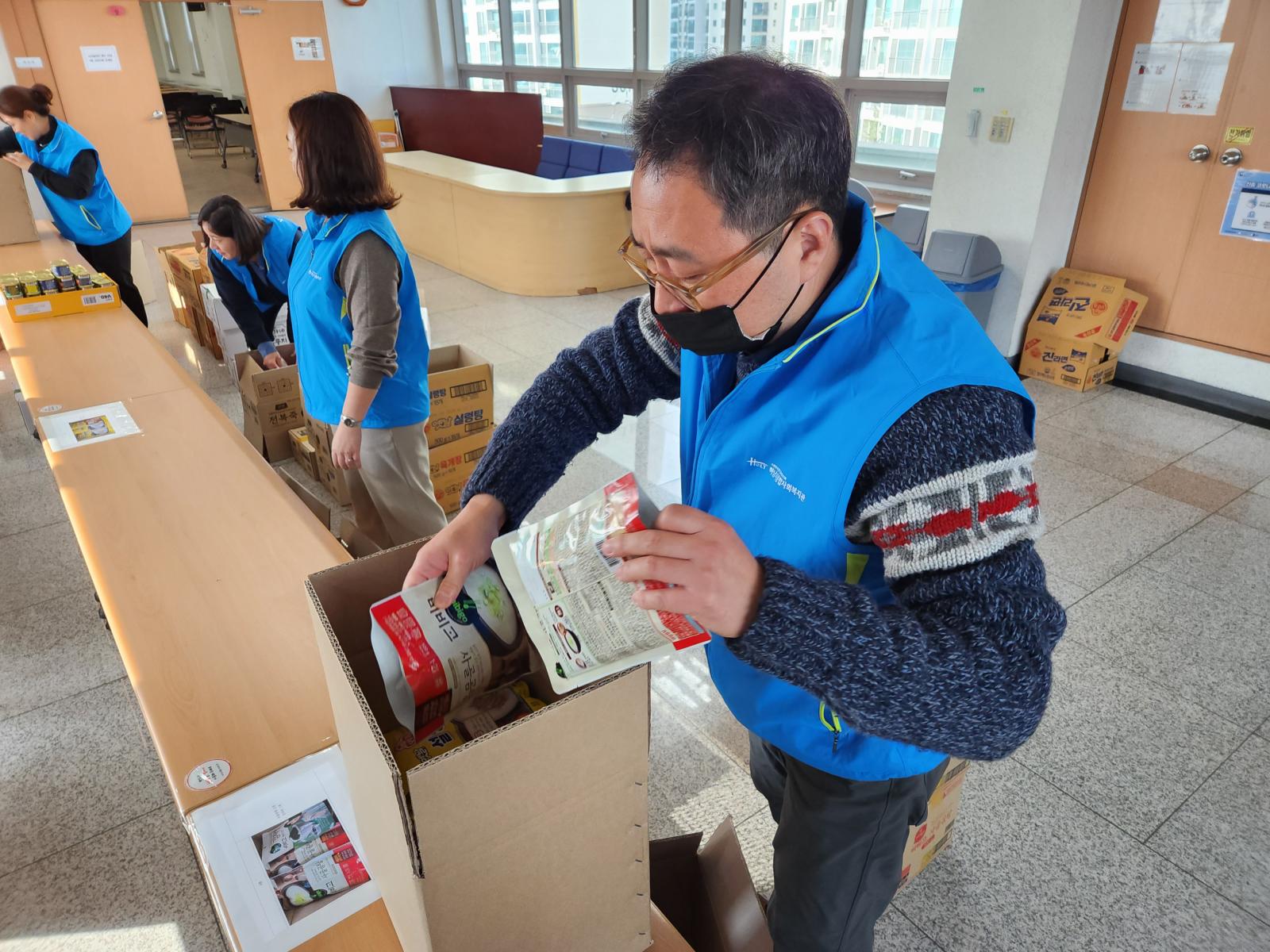 완성된 식품 상자는 지역주민분들 댁으로