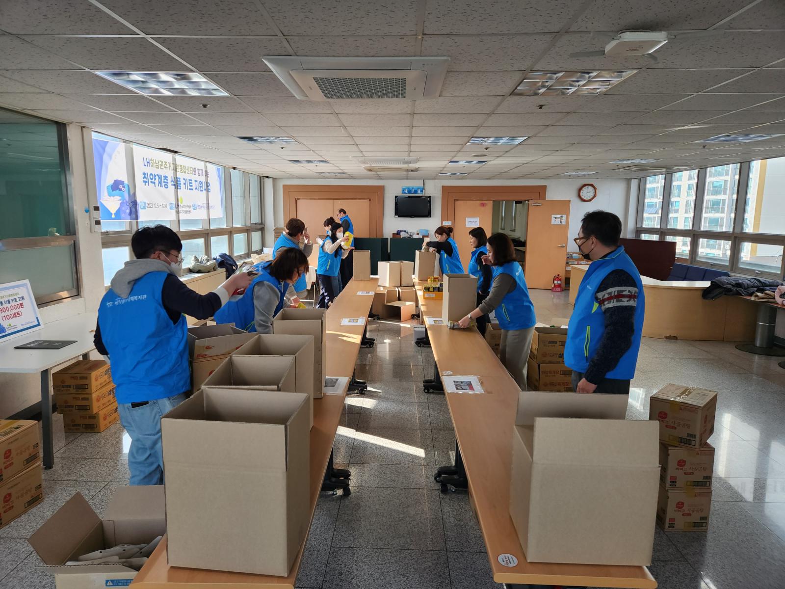 다같이 힘을 모아 총 100분에게 전해드릴 식품 상자를 완성하였습니다.
