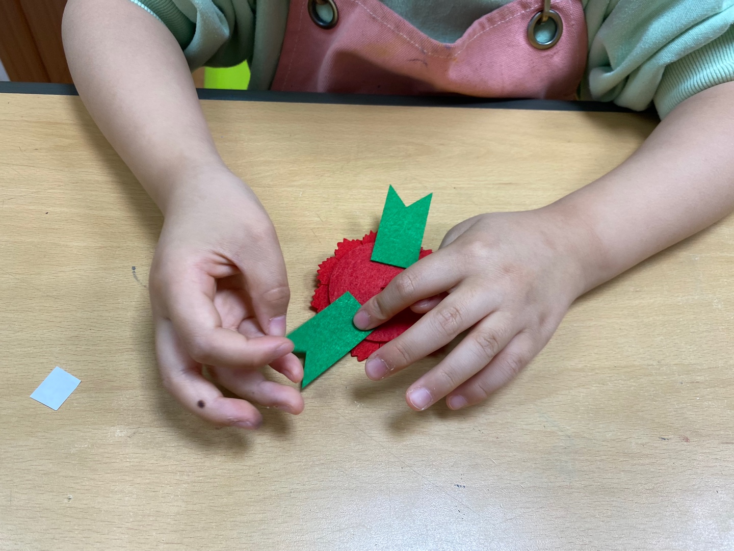 펠트 카네이션 꽃잎을 손으로 뜯고, 진주 장식을 끼우고, 잎을 붙이고