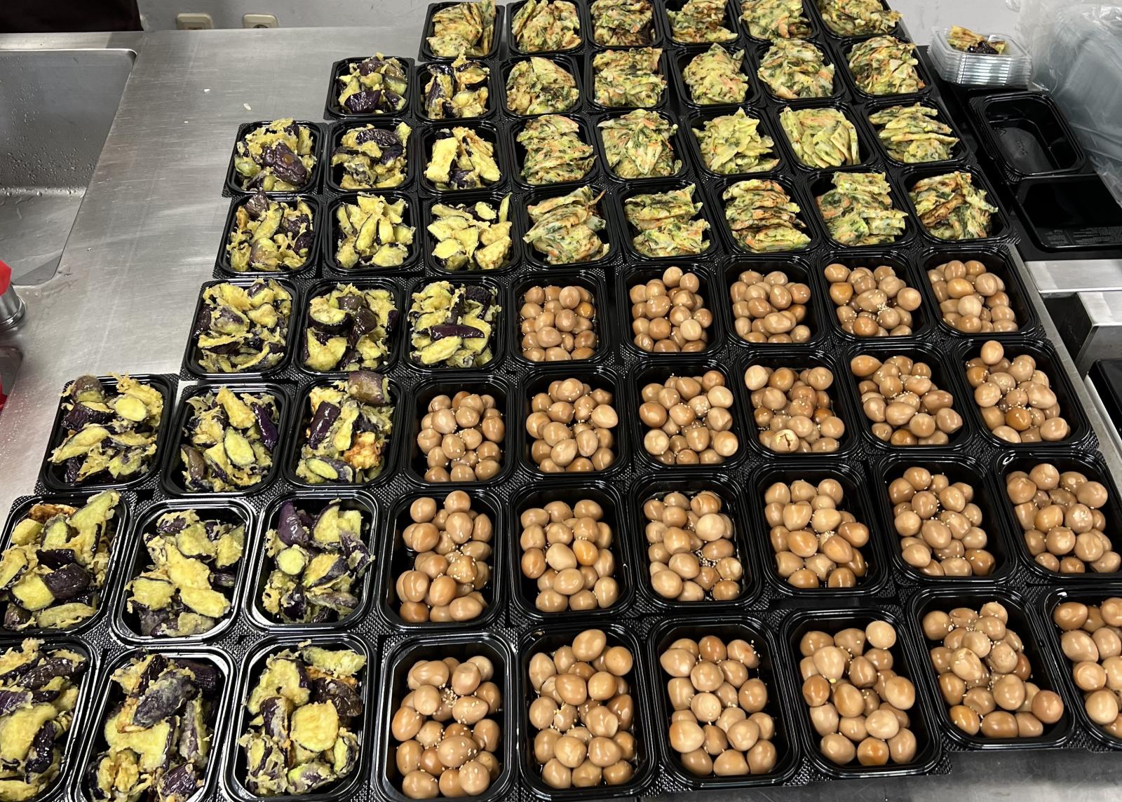 8월의 밑반찬 메뉴는 가지튀김, 메추리알조림, 야채전입니다!