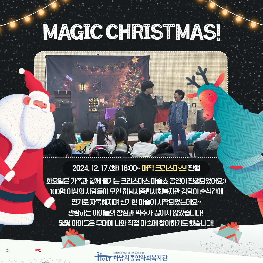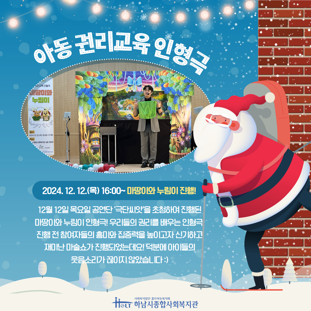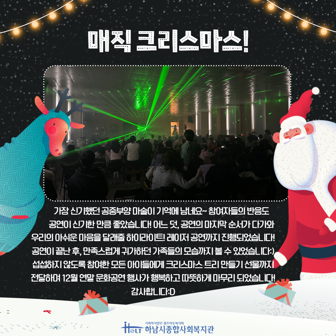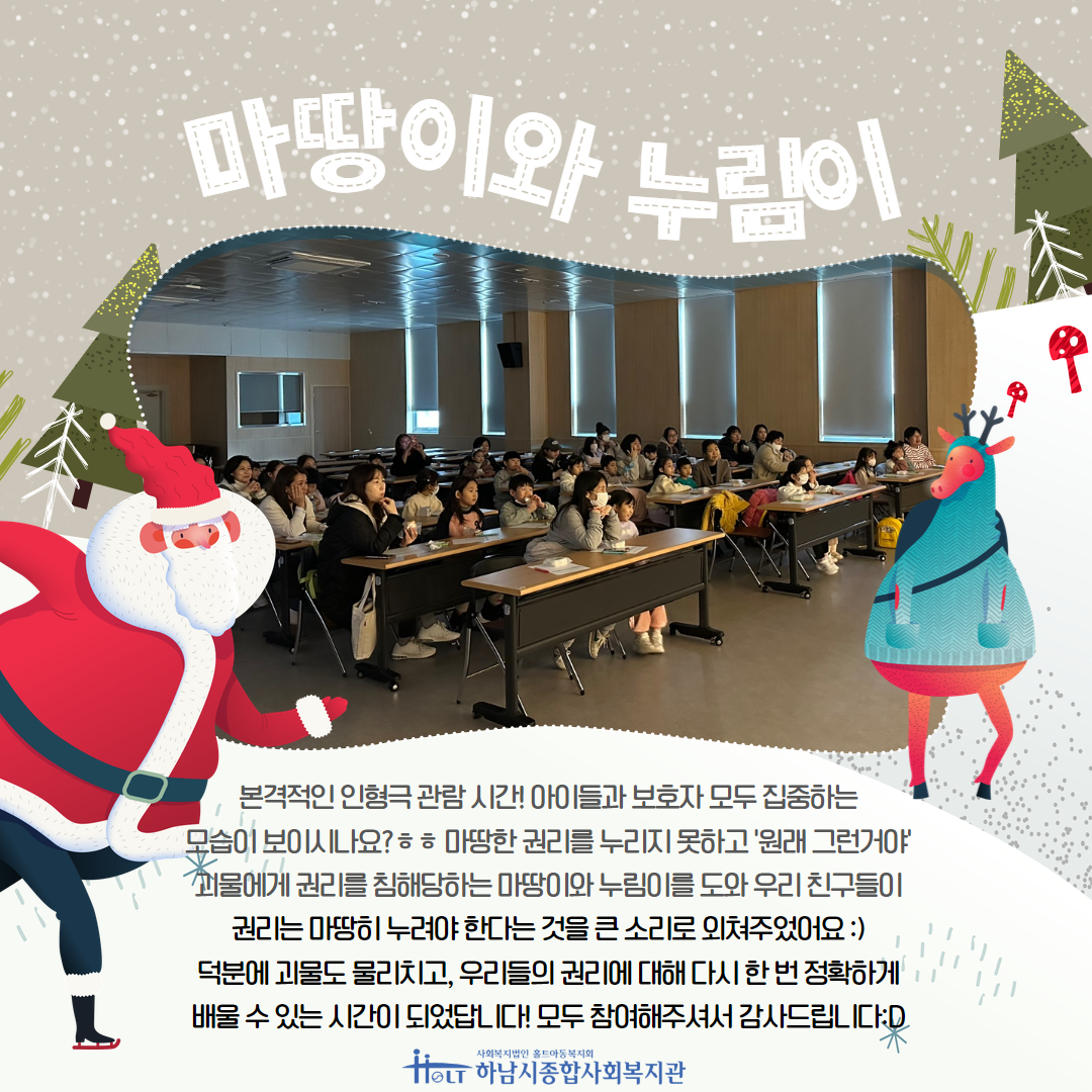 2024 가족문화행사 '12월 연말 행사' 진행 2024-12-19 조회수 1,483 2024 후원자·자원봉사자의 밤 '세상을 밝히는 빛' 현장스케치 2024-12-13 조회수 1,765 2024 꿈디자이너 보호자모임 6회기 실시 2024-12-11 조회수 1,493 오븐엔조이 파운터코리아반 12월 제과제빵 후원 2024-12-10 조회수 1,069 2024년 하남도시공사와 함께하는 '사랑의 연탄' 지원사업 2024-12-06 조회수 1,999 사람과 사람 사이를 잇다 ‘사이사이’ 네트워크 회의 실시(3회기) 2024-12-05 조회수 1,245 한국자유총연맹 하남시지회 청년회, 하남시 취약계층 어르신을 위한 쌀과자 2024-12-02 조회수 1,515 2024 아동권리 증진사업 '오늘은 노는 날! - 4기' 10월 소식 2024-11-29 조회수 1,684 2024년 3차 부모교육 '학교폭력, 소통하는 부모' 2024-11-29 조회수 1,727