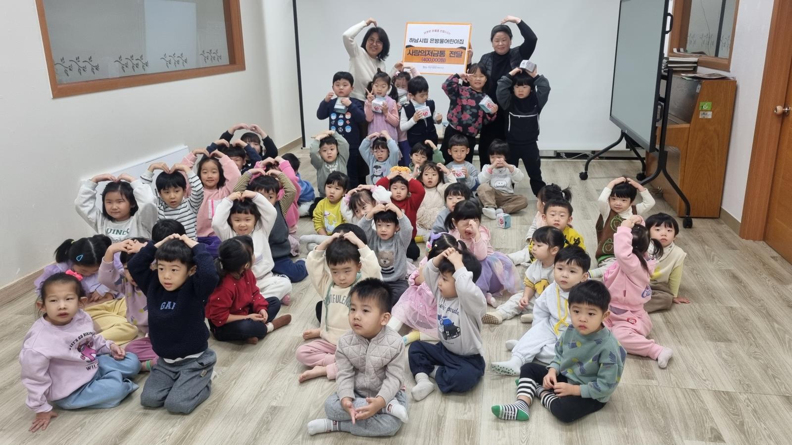 어린이집 원아들이 정성껏 모은 저금통 후원금(400,150원)을 전달받았다고 밝혔습니다.