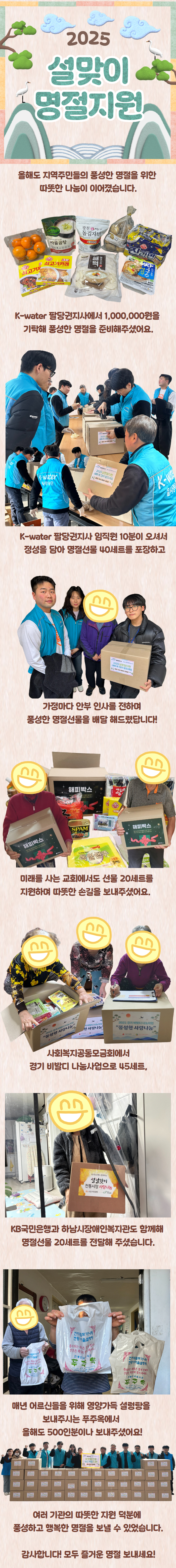 2025 설 명절 선물 지원(K-water 팔당권지사, 미래를 사는 교회, 사회복지공동모금회, KB국민은행, 하남시장애인복지관, 푸주옥 설렁탕) 작성일 : 2025.01.24 | 조회수 : 1591