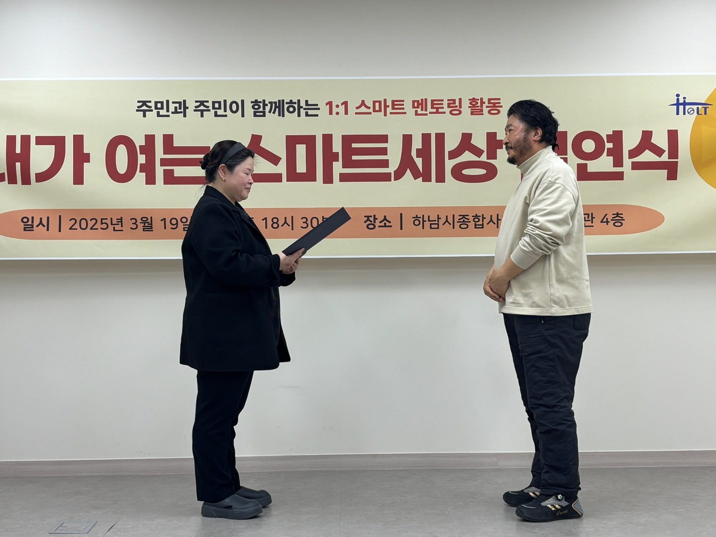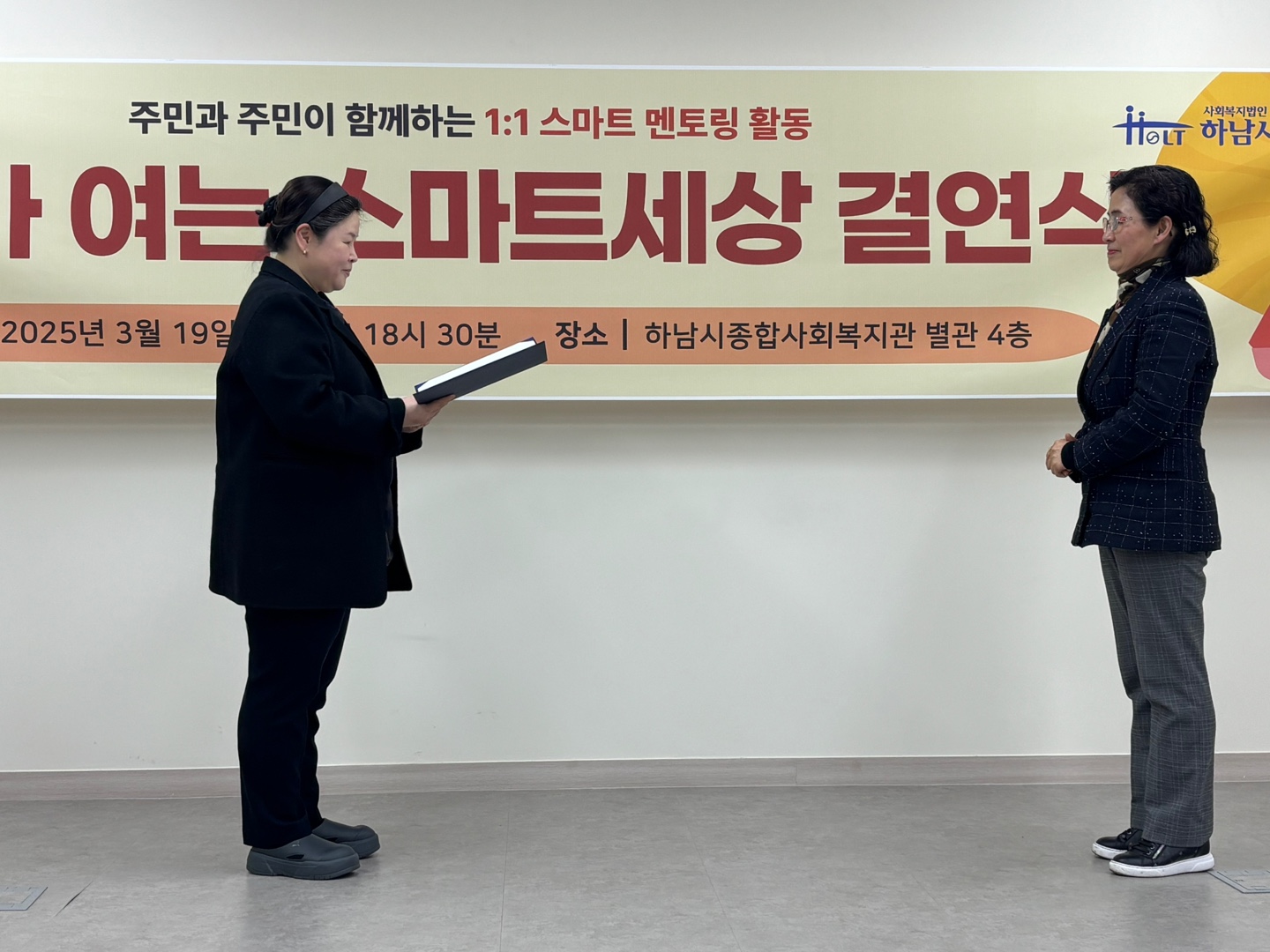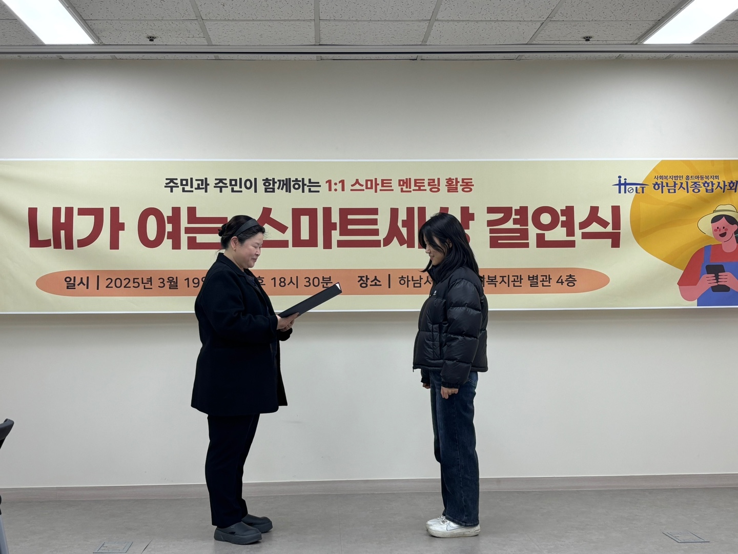 앞서 관장님의 인사 말씀과 함께 참석해주신 멘토분들에게 '2025년 스마트 멘토링' 임명장을 수여하였습니다.