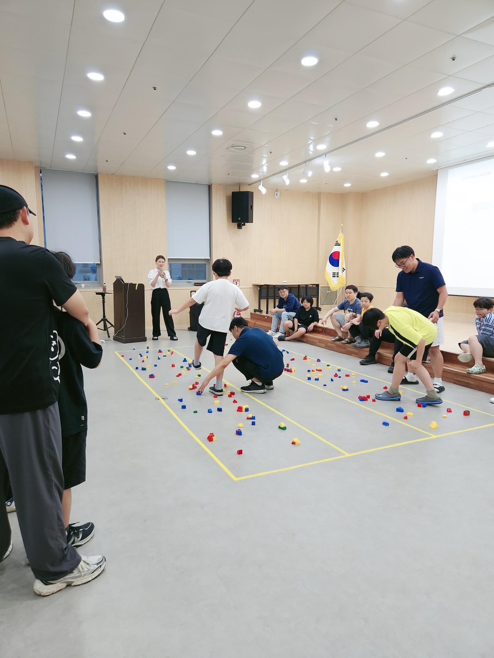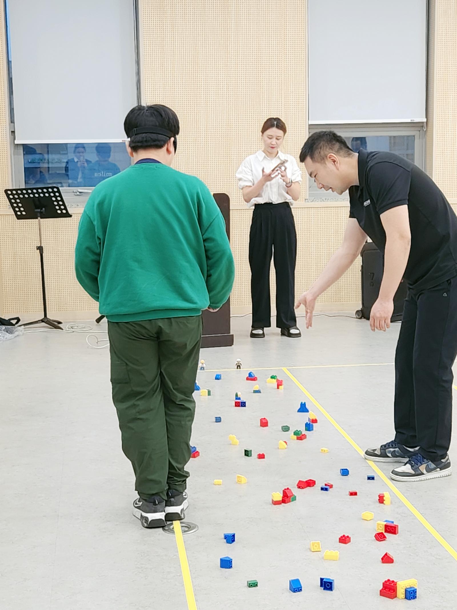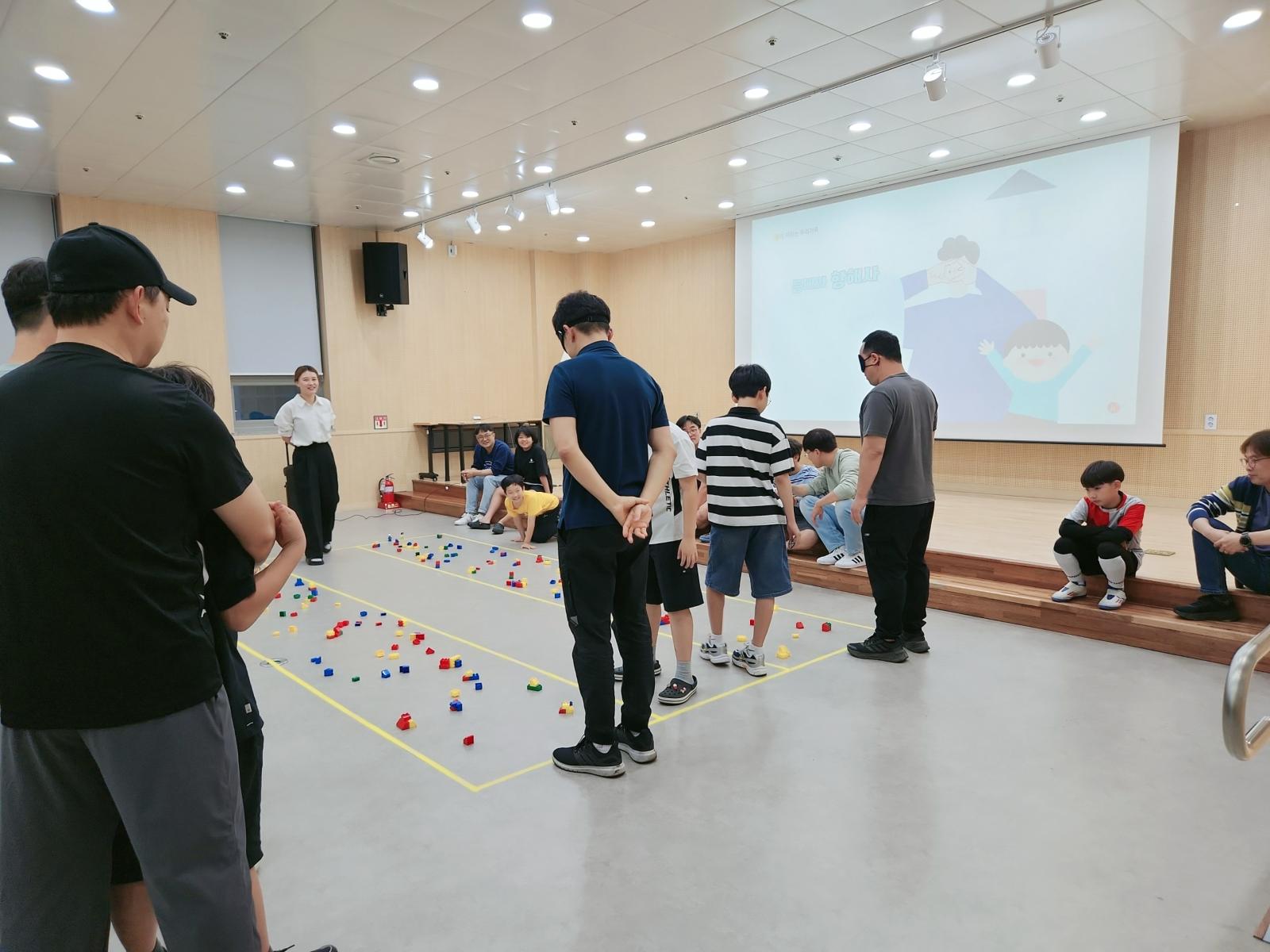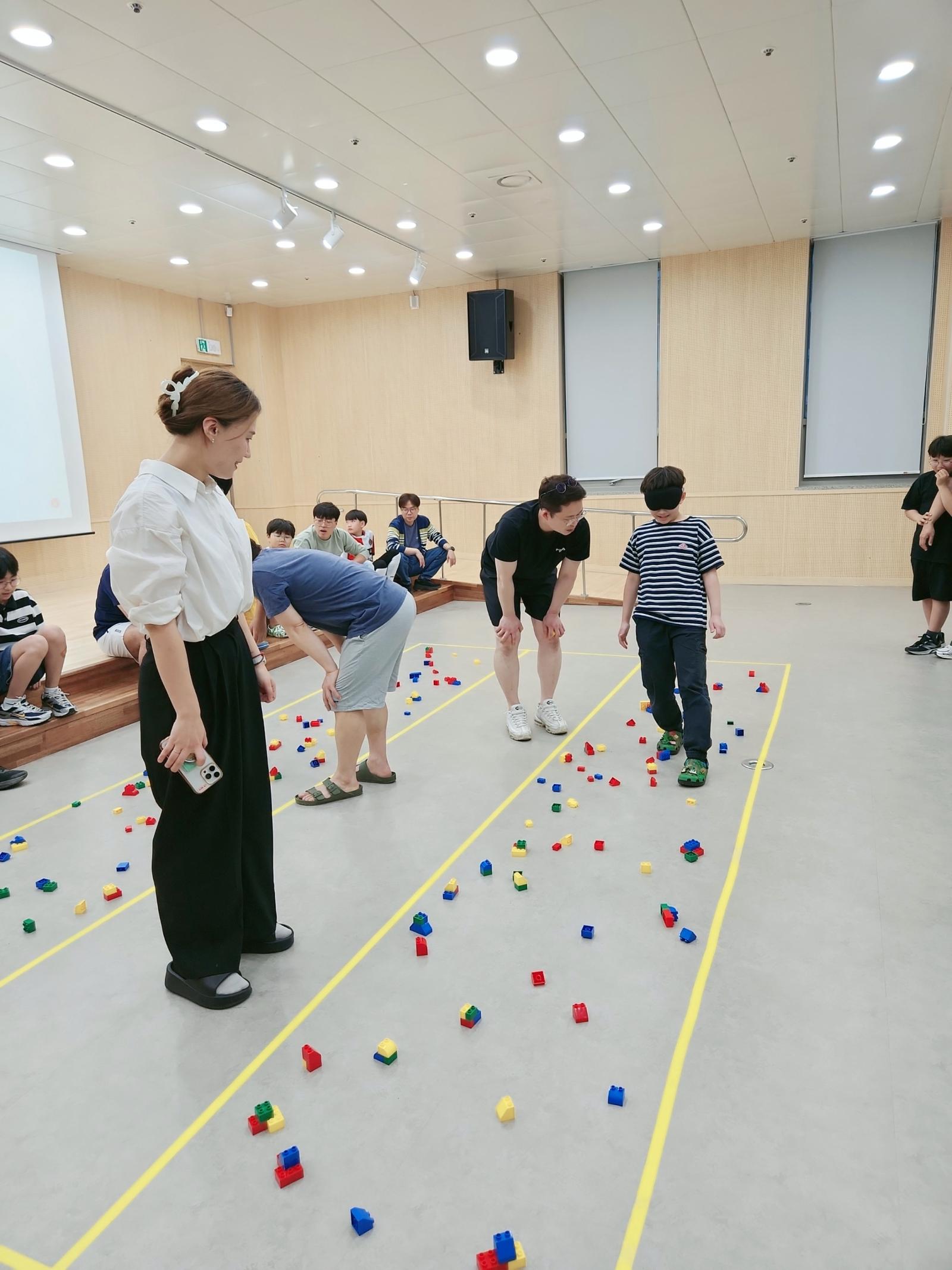 바닥에 자유롭게 펼쳐있는 레고 장애물을 피해 아들이 눈을 가리고 아빠가 길을 알려주는 재미있는 게임을 했어요. 아빠와 아들이 친밀해지고 신뢰감을 형성할 수 있는 시간을 가졌어요~!