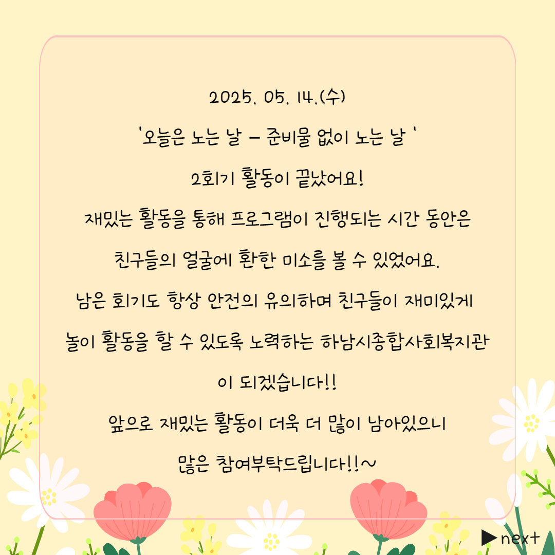K-water 팔당권지사, '가정의 달 식료품 지원' 사회공헌활동 2025-05-28 조회수 920 2025년 가족문화행사 <하남애(愛) 효(孝)심 가득 한마당> 2025-05-28 조회수 1,191 2025년 2차 부모교육 '사춘기 부자캠프' 2025-05-26 조회수 997 1박 2일 가족 힐링캠프 실시 2025-05-21 조회수 1,287 '마음의 정원' 원예프로그램 - 희망의 새싹 2회기 실시 2025-05-21 조회수 1,271 2025년 폐현수막 새활용 프로젝트 <보따리 봉사단> 4월 활동 2025-05-20 조회수 1,143 2025 '오늘은 노는 날!' - 준비물 없이 노는 날 2회기 2025-05-16 조회수 1,221 2025년 행복하댕: 행복한 하남 댕댕이 '우행시' 정기활동 진행 2025-05-14 조회수 1,149 '마음의 정원' 원예프로그램 - 희망의 새싹 1회기 실시 2025-05-13 조회수 1,074