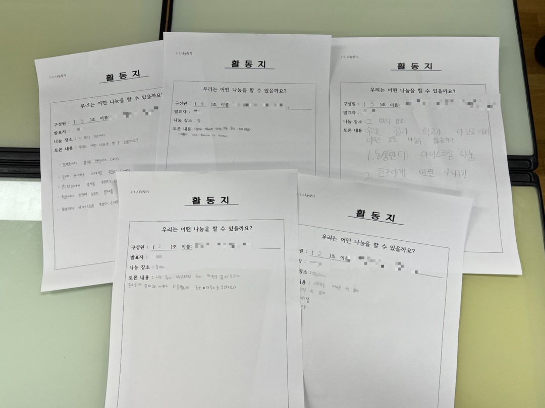나눔찾기 활동지 조별 활동, 패밀리체인 활동지 작성 후