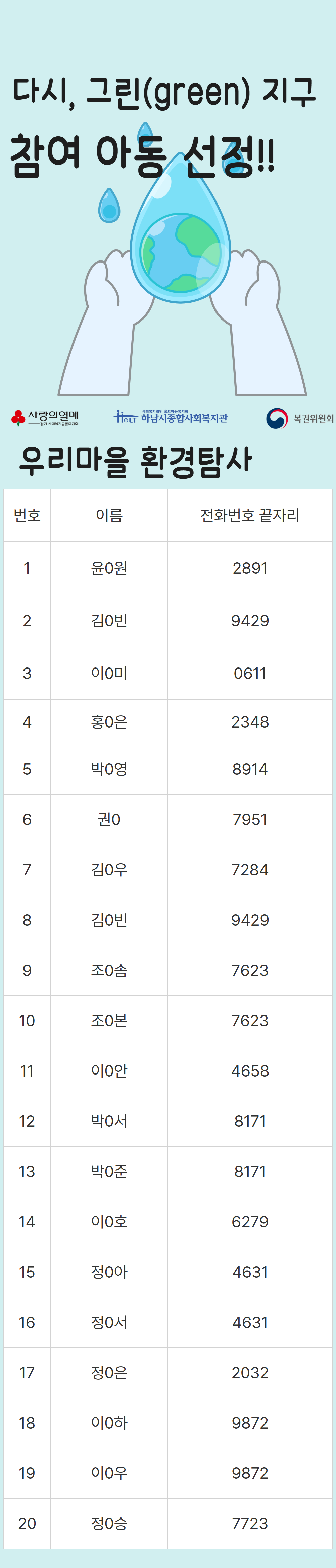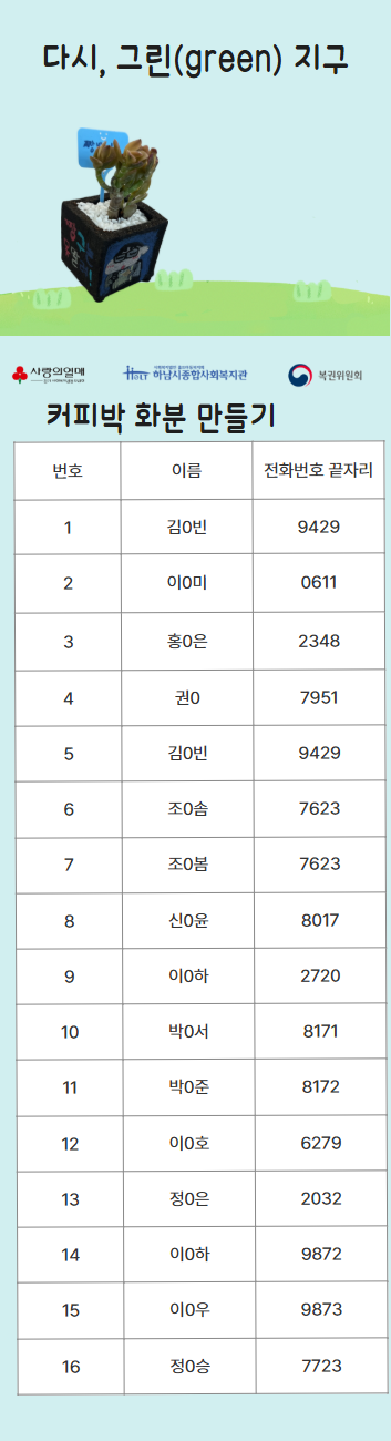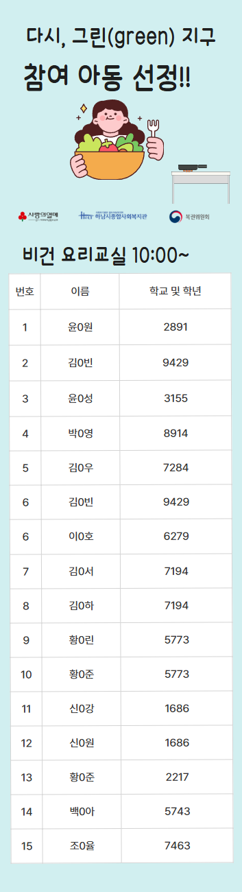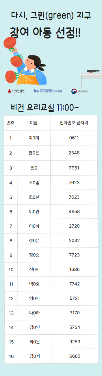 2025년 7월 행복나눔조리봉사단 활동 진행(하남먹거리 식사는 하셨어요? 2025-07-25 조회수 682 2025 초복삼계탕 지원(우양재단) 2025-07-25 조회수 329 2025 꿈디자이너 비전원정대 4회기 실시 2025-07-25 조회수 699 2025 꿈디자이너 비전원정대 3회기 실시 2025-07-25 조회수 876 다시, 그린(green) 지구 4단지 참여자 선정! 2025-07-23 조회수 765 2025년 초복 맞이 재가노인 식사배달 진행 2025-07-22 조회수 773 (느린학습자)일상생활적응행동척도검사 2025-07-17 조회수 907 2025년 폐현수막 새활용 프로젝트 <보따리 봉사단> 7월 활동 2025-07-17 조회수 778 오븐엔조이 파운터코리아반 7월 제과제빵 후원 2025-07-16 조회수 486