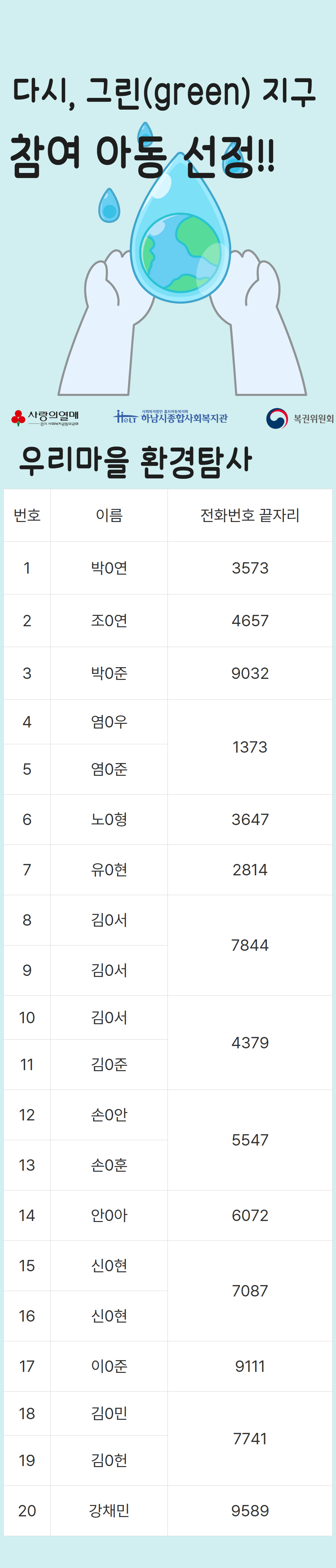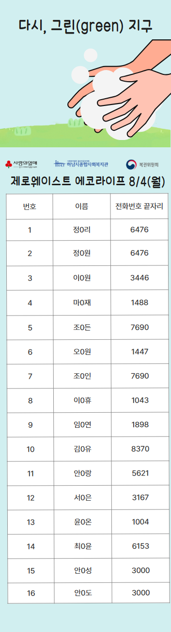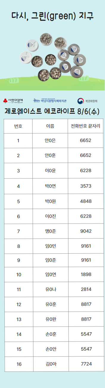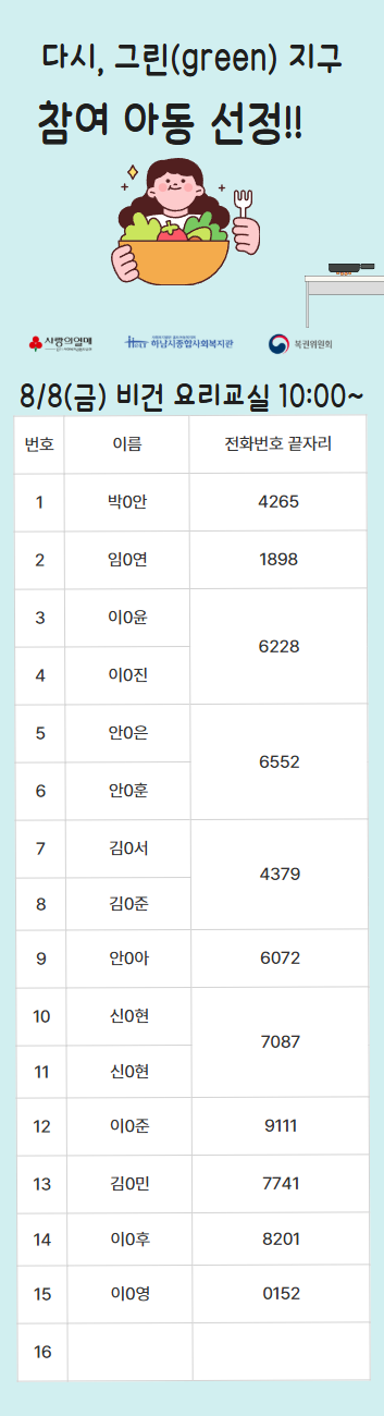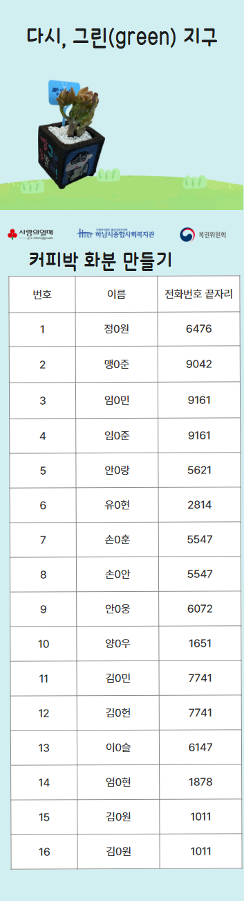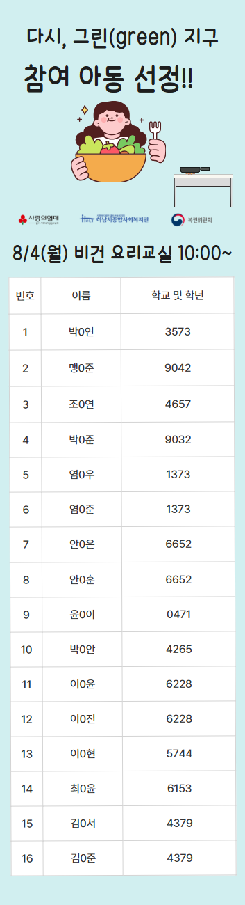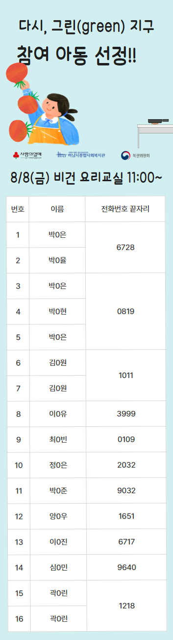 2025년 다시, 그린(green) 지구 복지관 참여자 선정 명단 공개 작성일 : 2025.07.29 | 조회수 : 839 * 비어있는 자리는 아직 추가 모집을 받고 있으니 신청해주세요!~ (신청하실 때 1인당 프로그램 3개로 제한되어 있으니, 잘 확인해주세요!)