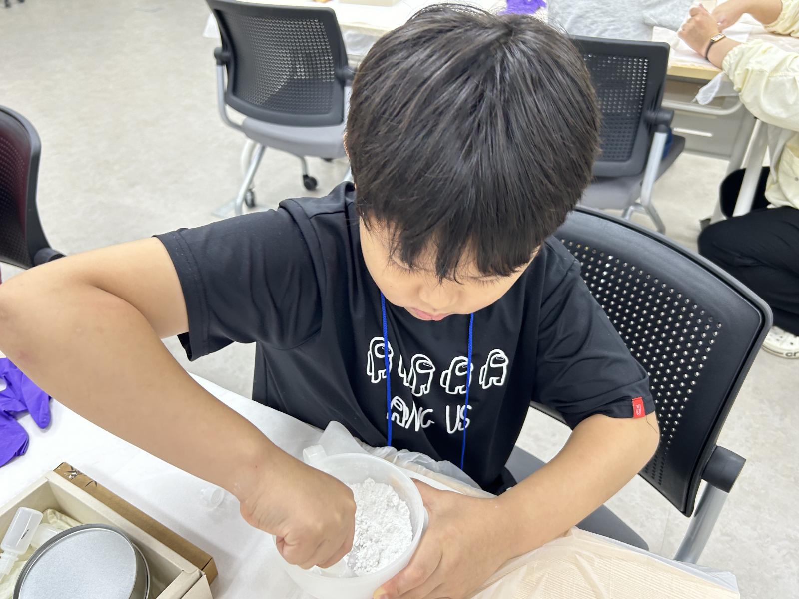 재료를 섞고 틀에 넣는 과정이
