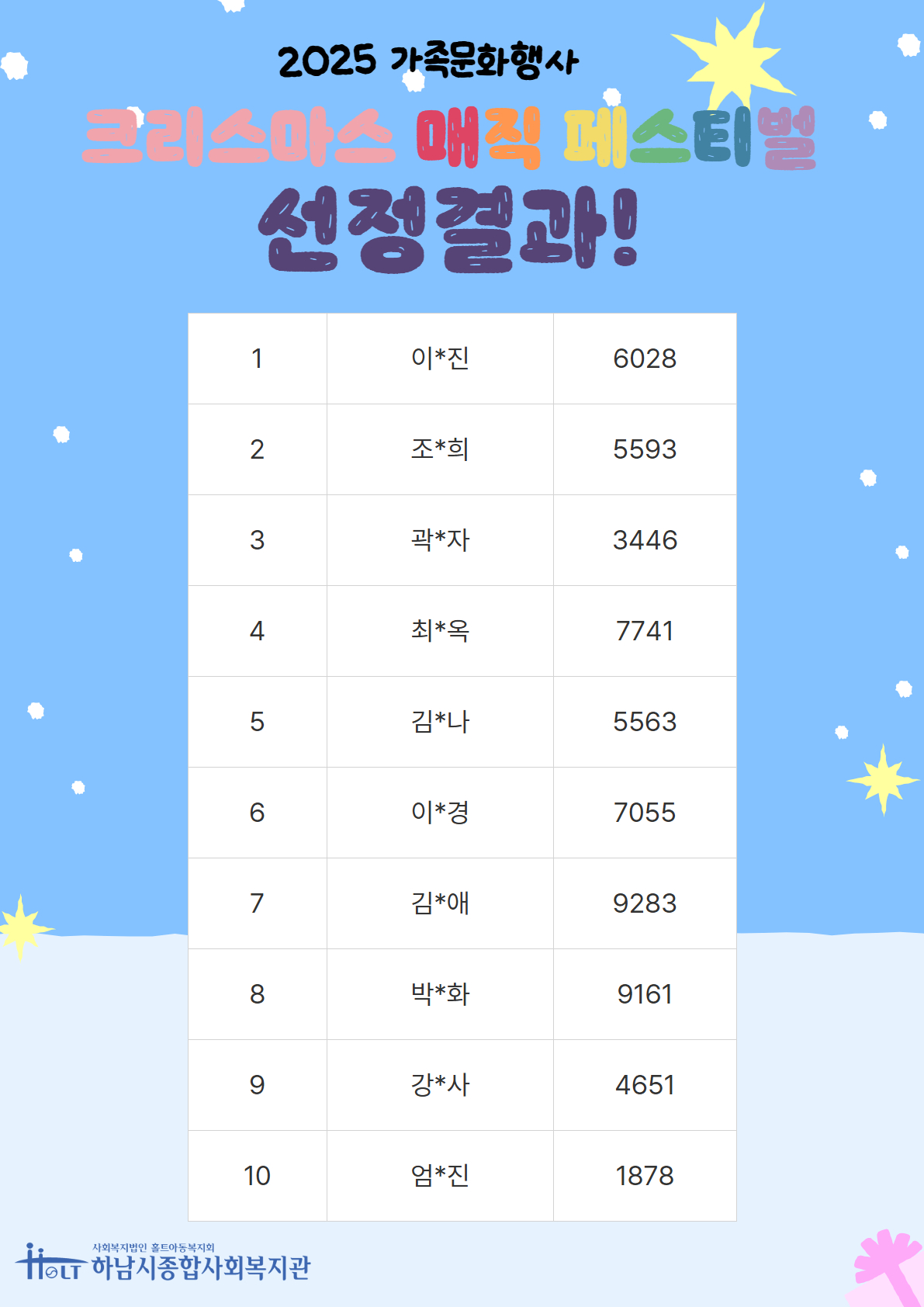 2025 가족문화행사 크리스마스 매직페스티벌 만족도 조사 추첨결과 작성일 : 2025.12.30 | 조회수 : 1087 첨부파일 : 매직 크리스마스! 홍보물.jpg 2025 가족문화행사'크리스마스 매직페스티벌' 만족도 조사 추첨결과를 발표드립니다.본 선정결과는 추첨 프로그램을 통해 공정하게 선정되었습니다! 궁금하신 경우에는 아래 링크를 통해 확인해주시기 바랍니다!https://youtube.com/shorts/2hs9gCvXZP4?feature=sharehttps://youtu.be/orKcN5Ts1as