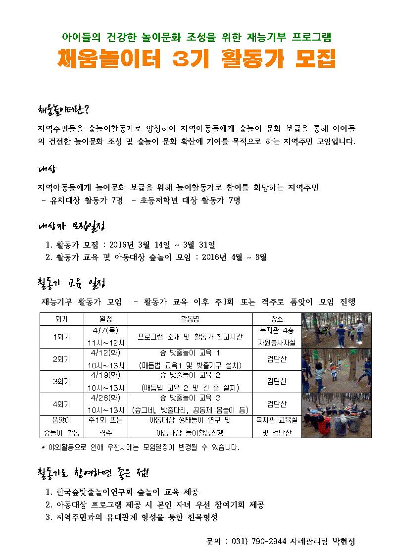 2016년 노인공익활동지원사업 참여자 및 수요처 간담회 실시 2016-04-08 조회수 13,347 2016년 상반기 어르신자원봉사자 보수교육 안내 2016-04-08 조회수 14,326 2016 저소득 가정 건강증진 프로그램 온기종기(溫器悰器) 2016-03-24 조회수 13,504 2016년 노인 공익활동지원사업 합동 발대식 및 활동교육 실시완료 2016-03-23 조회수 14,709 채움놀이터 3기 활동가 모집 2016-03-11 조회수 13,584 2016년 제1차 운영위원회 개최 2016-03-11 조회수 13,761 2015년 겨울방학 늘해랑학교 2016-03-04 조회수 14,692 2016년 신년업무보고 실시 2016-02-24 조회수 14,616 2016 저소득 가정 건강증진 프로그램 온기종기(溫器悰器) 실시 2016-02-22 조회수 13,487