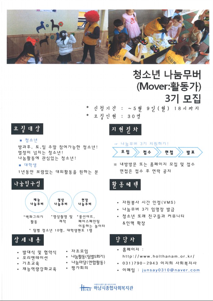 유디치과 하남점과 업무협약 체결 2016-05-04 조회수 14,272 2016 바른 인성함양 프로젝트 '인성의 조건' - 인성교 2016-05-03 조회수 13,323 가족문화행사 공연(버블매직쇼) 홍보 2016-05-02 조회수 13,793 2016년 어르신자원봉사자 상반기 보수교육 실시 완료 2016-04-29 조회수 13,664 2016 저소득 가정 건강증진 프로그램 온기종기(溫器悰器) 진행 - 중식 2016-04-28 조회수 12,315 이마트 하남점 사회공헌 협약식 2016-04-26 조회수 13,262 2016년 3기 청소년 나눔무버 양성 프로그램 참여자 모집 2016-04-25 조회수 13,026 2016년 장애아동·청소년 방과후 교실 "꿈이나르샤" 모집 2016-04-20 조회수 13,726 신평초교와 안전한 등하굣길 조성을 위한 1사1교 업무협약 체결 2016-04-15 조회수 12,382