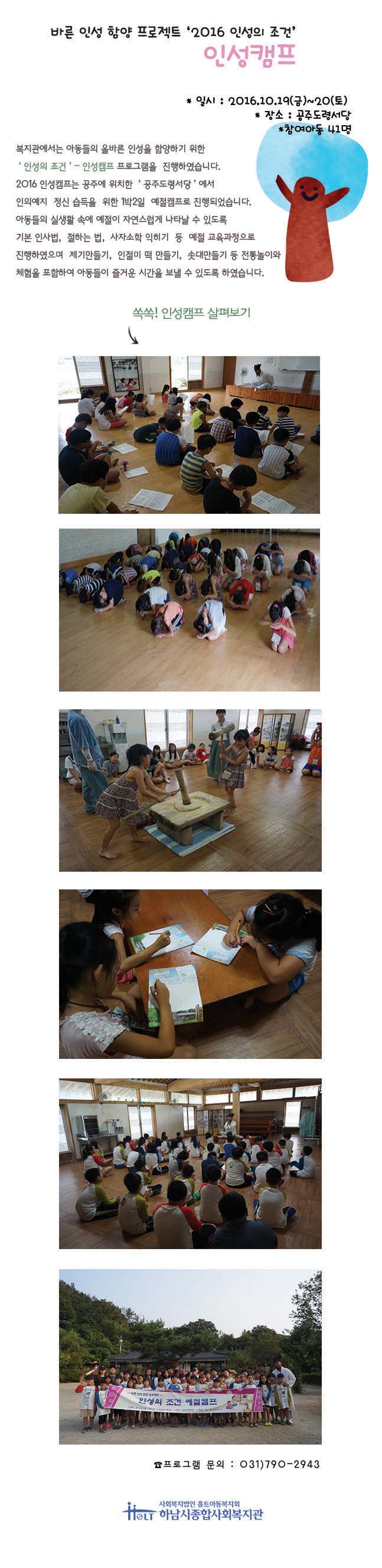 응답하라 2030 서포터즈 중간평가회의 2016-08-26 조회수 12,692 가족문화행사 공연(난타SHOW) 홍보 2016-08-25 조회수 13,647 2016년 '인성의 조건'-인성캠프 실시 2016-08-23 조회수 13,365 교류분석을 통한 체계적인 부모역할 훈련(일정 변경) 2016-08-23 조회수 12,746 어르신 건강체조 강사를 구인합니다. 2016-08-11 조회수 12,659 여름방학체험활동 2016-08-09 조회수 12,946 2016년 제10회 노인자원봉사학교 실시 2016-08-01 조회수 12,770 2016년 여름 가족체험행사 "롯데월드 바캉스" 참가자 모 2016-07-18 조회수 13,087 제7대 기관장 취임식 실시 2016-07-13 조회수 13,102