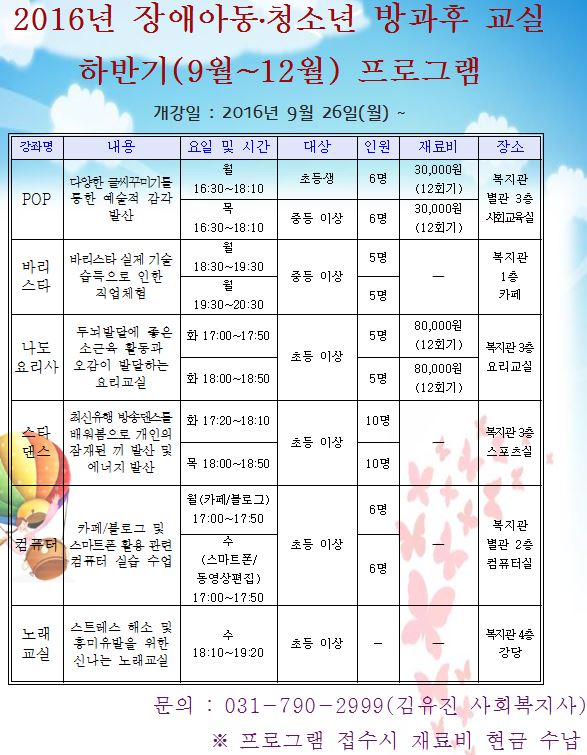2016년 하반기 장애아동청소년 방과후교실 참여자 모집 작성일 : 2016.09.20 | 조회수 : 15545 2016년 하반기 장애아동,청소년 방과후교실이 개강합니다.프로그램 시간표는 첨부된 사진을 참고 부탁드리며접수는 9월 21일부터 선착순 접수 가능하오니이용자분들의 많은 관심 바랍니다.감사합니다.