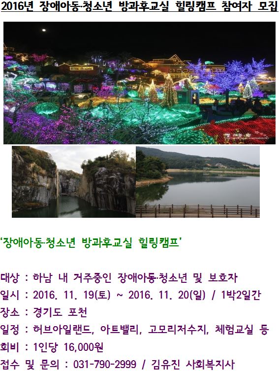 장애아동청소년 방과후교실 힐링캠프 참여자 모집 작성일 : 2016.11.09 | 조회수 : 12356 2016년 장애아동청소년 방과후교실 힐링캠프참여자를 모집합니다! 문의 사항은 031)790-2999 로 연락 주시면감사드리겠습니다. 많은 관심 부탁드립니다.