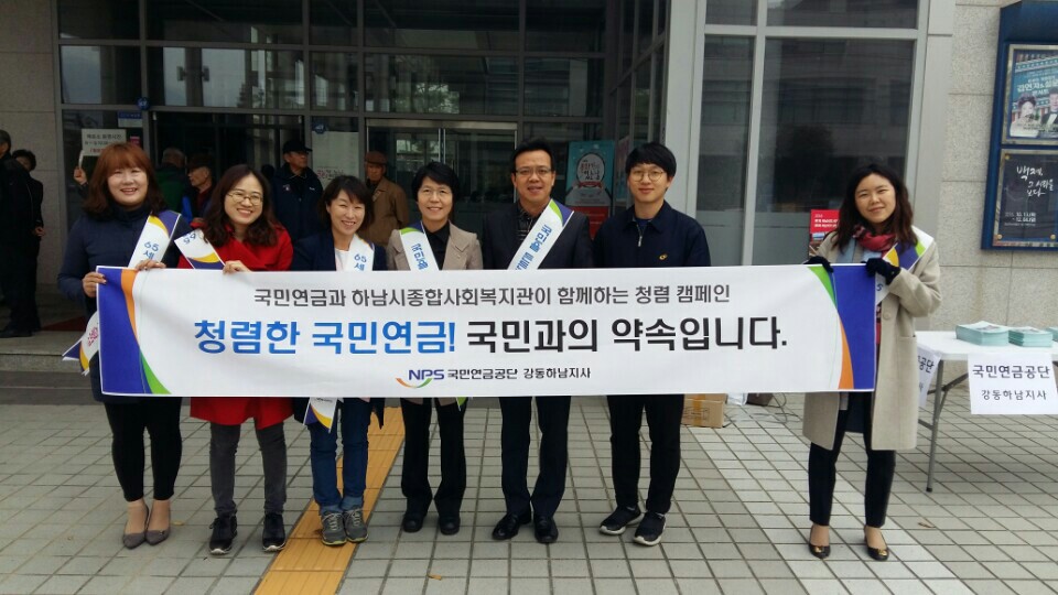 국민연금공단과 함께 하는 청렴홈보 캠페인 작성일 : 2016.11.14 | 조회수 : 12256 국민연금공단 강동하남지사와 2016년 11월 4일 하남문화예술회관 일대에서 청렴홍보 거리 캠페인을 실시하였습니다. 이 날 문화예술회관을 찾은 지역주민들에게 청렴홍보물 배포하고 실천적 활동으로 청렴한 사회 만들기에 앞장설 것을 다짐하였습니다.