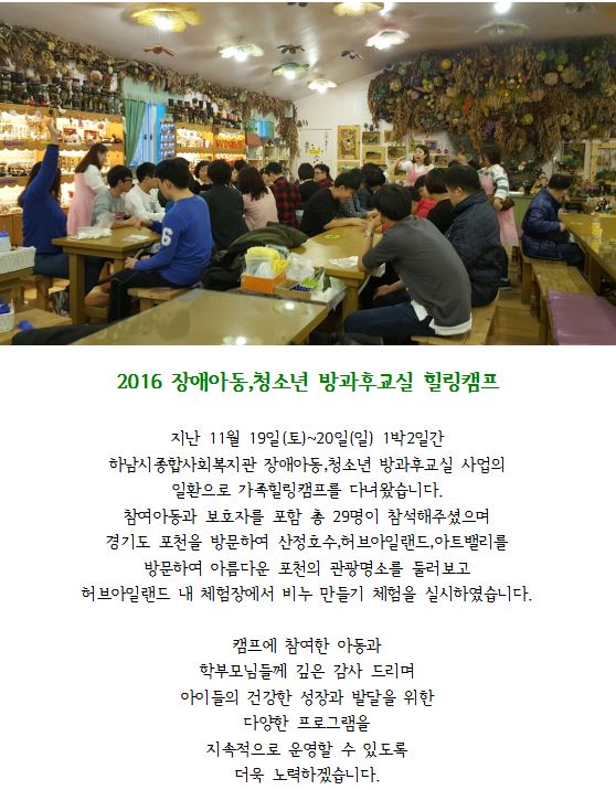 2016년 노후준비교육 실시 2016-12-30 조회수 12,517 2016년 자원봉사자 보수교육(소양교육) 실시 2016-12-09 조회수 12,349 2016년 노인사회활동지원사업 참여자 및 수요처 간담회 실시 2016-12-07 조회수 12,827 2016년 노후준비교육 참가자 모집 2016-12-06 조회수 12,044 2016 메리주머니 만들기 아동산타 모집 안내 2016-12-01 조회수 12,849 2016 지역주민 교육 안내 2016-12-01 조회수 13,660 2016년 하반기 자원봉사자 보수교육 안내 2016-11-30 조회수 11,813 2016 장애아동청소년 방과후교실 힐링캠프 진행 2016-11-23 조회수 11,816 밸리댄스 수상을 축하합니다. 2016-11-17 조회수 13,069