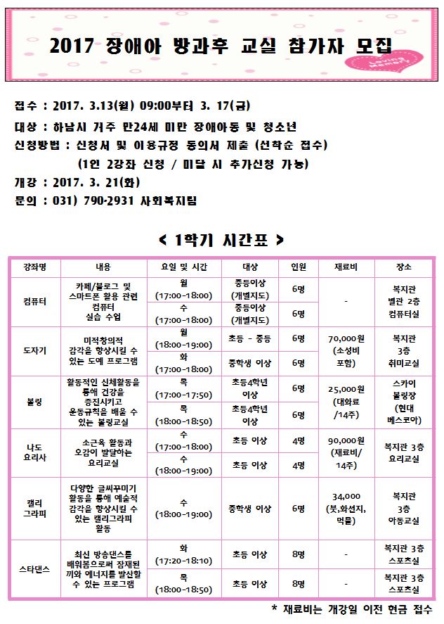 착한이웃 현판 전달식 진행 (아트에이브이(주)) 2017-03-27 조회수 13,092 2017 이마트와 함께하는 사랑 나눔 바자회 실시 2017-03-24 조회수 12,535 착한이웃 현판 전달식 진행 (나도람FC, 삼송빵집, 잼파파) 2017-03-08 조회수 13,138 2017 장애아방과후모집 2017-03-07 조회수 12,257 은빛사랑나눔-뜨개질봉사단 후원금 전달식 2017-02-07 조회수 12,437 2017 새내기 희망드림 교복지원사업 지원금 전달식 2017-02-06 조회수 12,688 하남시종합사회복지관 착한이웃 1호점(하남도시공사) 현판식 진행 2017-02-06 조회수 11,693 한국수자원공사 물사랑나눔단 명절선물 전달식 2017-01-25 조회수 12,260 한국전력공사 동서울전력지사 명절지원금 전달식 2017-01-19 조회수 12,610