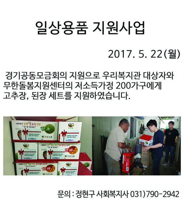 신용보증기금 하남지점 후원금품 전달식 2017-05-26 조회수 12,456 2017년 자원봉사 기초교육 안내 2017-05-25 조회수 11,695 저소득층 일상용품 지원 2017-05-22 조회수 12,392 국민연금공단과 함께하는 장수사진 촬영 2017-05-18 조회수 12,124 동성제약과 함께하는 어르신 염색서비스 '다시 찾은 이팔청춘' 2017-05-14 조회수 12,273 아이품애(온라인육아커뮤니티) 저소득가정 지원을 위한 후원금 전달식 2017-05-11 조회수 12,765 이마트 하남점과 함께하는 사랑의 공기청정기 전달식 2017-05-11 조회수 12,825 가족문화행사 5월 가족의 달 공연(호랑이오빠 얼쑤) 홍보 2017-04-26 조회수 12,753 동성제약 염색봉사단과 함께하는 '다시 찾은 이팔청춘' 2017-03-27 조회수 11,949