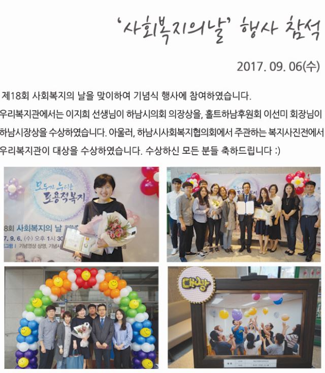 국민연금공단 강동하남지사 후원물품 전달식 2017-09-26 조회수 13,571 2017년 바른인성함양프로젝트 '인성의조건' 인성함양 가족 2017-09-25 조회수 12,082 햄버거나눔지원사업 '행복배달' 실시 2017-09-20 조회수 11,659 (주)동성제약 후원물품 전달식 2017-09-19 조회수 12,374 2017년 복지관 직원 연수 실시 2017-09-18 조회수 12,993 제18회 사회복지의 날 기념행사 수상 2017-09-12 조회수 13,121 국민연금공단과 함께하는 장수사진 촬영 2017-09-07 조회수 12,733 노인사회활동지원사업 참여자 활동교육 실시완료 2017-09-01 조회수 12,912 착한이웃 현판 전달식(아이제이마케팅) 2017-08-31 조회수 12,832