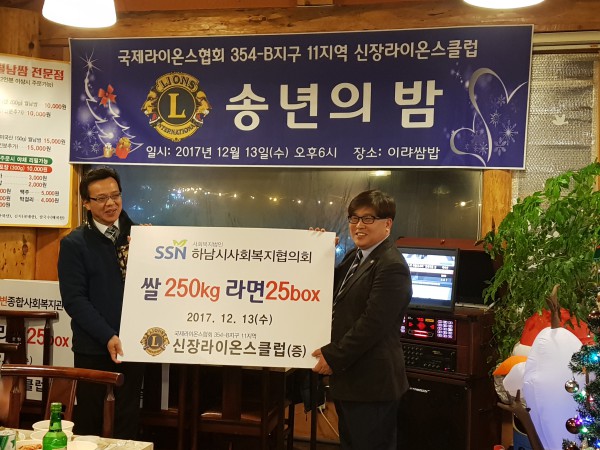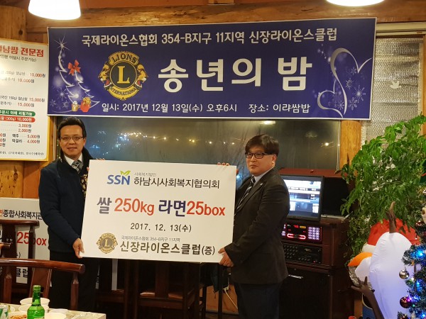신장라이온스클럽 후원물품 전달식 작성일 : 2017.12.13 | 조회수 : 12199 2017년 12월 13일(수) 18:00~21:00 신장라이온스클럽에서 저소득 대상자를 위한쌀(250kg과 라면25박스)를 후원해 주셨습니다.후원에 주신 신장라이온스클럽 조창환 회장님과 회원분들께 감사드립니다.전달받은 소중한 후원물품은 내부회의를 통해 필요한 대상자에게 전달하겠습니다.