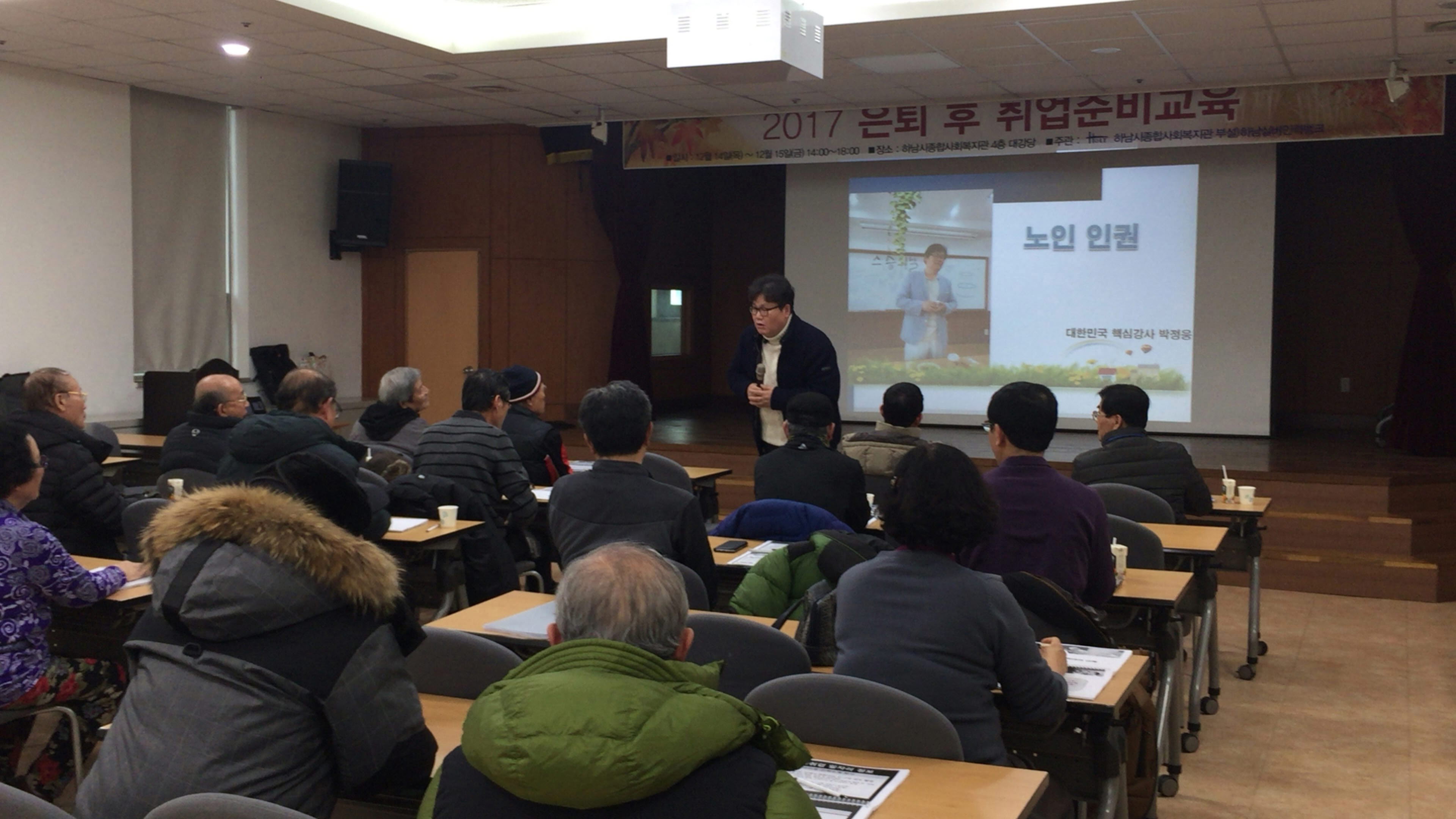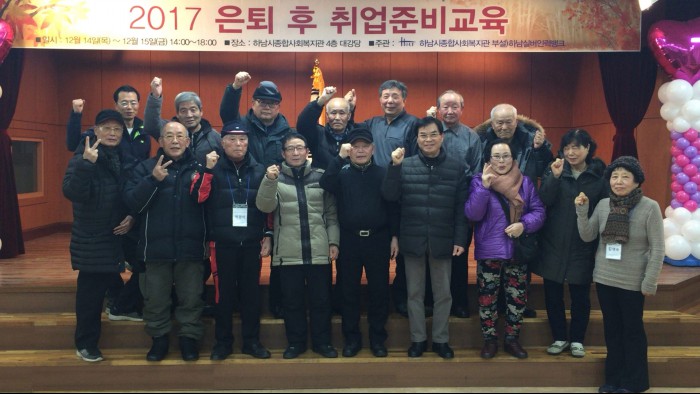 2017년 하반기 은퇴 후 취업준비교육 작성일 : 2017.12.18 | 조회수 : 11954 은퇴 후 어르신들의 구직활동에 도움이 되고자 12월 14,15일 2일간 '은퇴 후 취업준비교육'을 진행하였습니다.추운 날씨에도 복지관까지 찾아주셔서 열심히 교육에 참석하시는 어르신들의 열심히 참여하시는 모습이 참 보기좋았습니다.어르신들의 열정이 꼭 취업성공까지 이루어지시길 기원합니다.감사합니다.