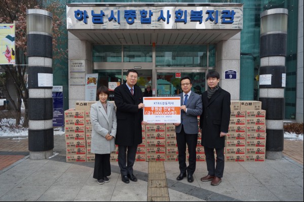 이번 전달식은 주식회사 케이티앤지 강동지사 모든 직원들이 매달 조금씩 본인의 월급에서 일정금을 기부하여 마련한 후원금으로, 전달된 후원금은 월동용품으로 구매하여 하남시 지역내 저소득가정에 전달될 예정이다.