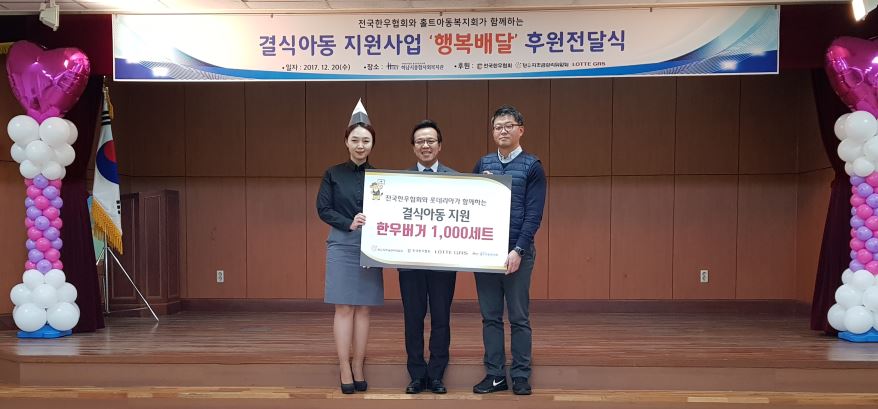 전국한우협회&롯데리아 후원물품 전달식 작성일 : 2017.12.20 | 조회수 : 11810 2017년 12월 20일(수) 16:00~17:00 전국한우협회와 롯데리아에서"하남시 지역내 결식아동들이 맛있게 먹었으면 좋겠다"."며, 한우버거 1,000세트를 후원해 주셨습니다.전국한우협회와 롯데리아 종사자 및 임직원분들께 감사드리며, 후원해 주신 소중한 후원물품은 하남시 지역내 결식아동대상자에게잘 전달하겠습니다.후원에 다시한번 감사드립니다.