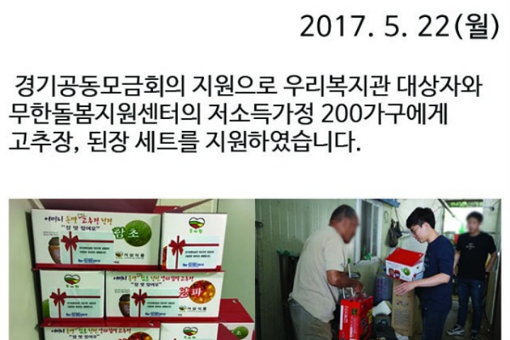 신용보증기금 하남지점 후원금품 전달식 2017-05-26 조회수 12,456 2017년 자원봉사 기초교육 안내 2017-05-25 조회수 11,694 저소득층 일상용품 지원 2017-05-22 조회수 12,390 국민연금공단과 함께하는 장수사진 촬영 2017-05-18 조회수 12,124 동성제약과 함께하는 어르신 염색서비스 '다시 찾은 이팔청춘' 2017-05-14 조회수 12,272 아이품애(온라인육아커뮤니티) 저소득가정 지원을 위한 후원금 전달식 2017-05-11 조회수 12,763 이마트 하남점과 함께하는 사랑의 공기청정기 전달식 2017-05-11 조회수 12,825 가족문화행사 5월 가족의 달 공연(호랑이오빠 얼쑤) 홍보 2017-04-26 조회수 12,752 동성제약 염색봉사단과 함께하는 '다시 찾은 이팔청춘' 2017-03-27 조회수 11,948