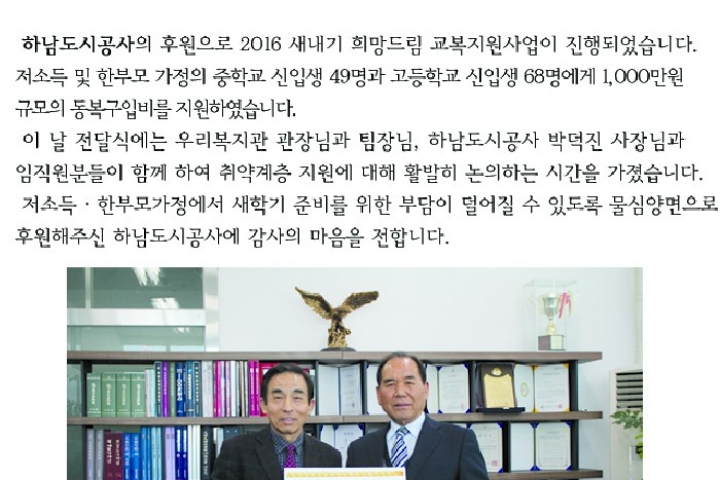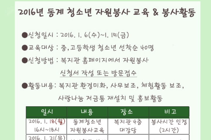 2016 새내기희망드림 교복지원사업(동복) 2016-02-15 조회수 14,593 2016 동계 청소년 자원봉사 교육(변경) 안내(인원마감 완료) 2016-01-08 조회수 15,379 노인 우울 및 자살예방 교육 종무식 2015-12-22 조회수 14,822 2014년도 시무식 실시 2014-01-02 조회수 14,715