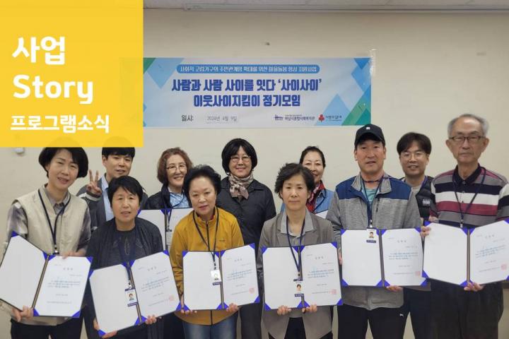 하남시 사회복지사의날, 수상을 축하드립니다! 2024-04-23 조회수 3,633 어르신 리포터와 청년 크리에이터가 함께하는 '니캉내캉' OT 진행 2024-04-18 조회수 3,038 사람과 사람 사이를 잇다 '사이사이' 1차 정기모임 2024-04-16 조회수 3,054 2024 '내가 여는 스마트세상' OT 및 결연식 진행 2024-04-15 조회수 2,816 2024년 1차 사례관리 외부자문 실시 2024-04-05 조회수 3,374 사람과 사람 사이를 잇다 ‘사이사이’ 1차 양성교육 2024-04-05 조회수 3,282 [오늘은 노는 날! - 1기] 준비물 없이 노는 날 진행(1회기) 2024-04-05 조회수 3,759 똑똑한 엄마 지원사업(HD현대1%나눔재단, 홀트아동복지회) 2024-04-03 조회수 3,313 [오늘은 노는 날! - 1기] 최종 선정 명단 2024-04-01 조회수 3,311