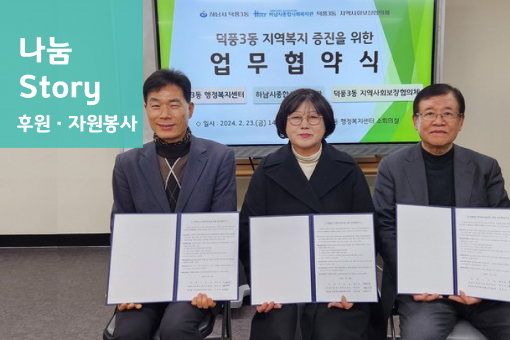 2024 노인일자리 및 사회활동 지원사업 발대식 실시 2024-02-28 조회수 3,899 지역복지 증진을 위한 민ㆍ관 업무 협약 체결 2024-02-26 조회수 3,614 2024년 설명절 선물릴레이(레보딕스, 푸주옥설렁탕, K-water팔당권 2024-02-22 조회수 3,502 폐현수막 새활용 프로젝트 '보따리 봉사단' 2월 3주차 활동 2024-02-21 조회수 3,599 손사랑 나눔 봉사단 2월 셋째 주 활동 2024-02-15 조회수 3,528 폐현수막 새활용 프로젝트 '보따리 봉사단' 2월 2주차 활동 2024-02-14 조회수 3,433 2024년 재가어르신 설 명절 선물키트 제공 2024-02-14 조회수 4,030 하남이음 Vol.90호 발간 및 독자퀴즈 당첨자 안내 2024-02-14 조회수 4,235 손사랑 나눔 봉사단 2월 첫째, 둘째 주 활동 2024-02-13 조회수 3,645
