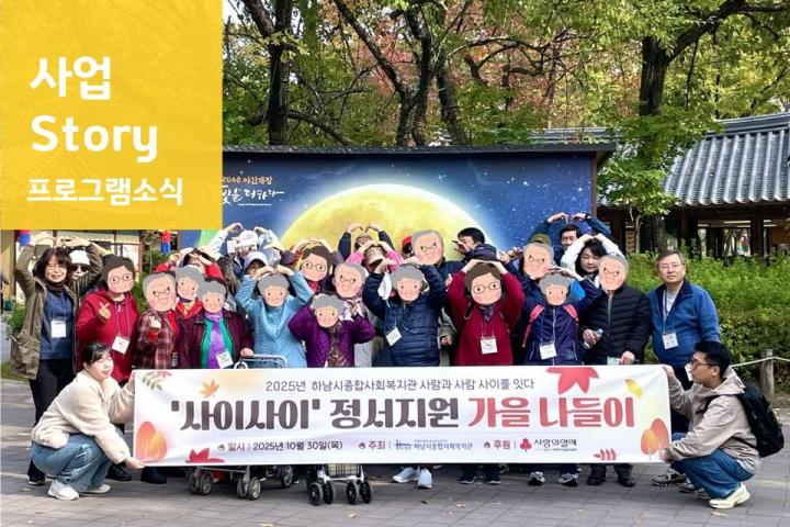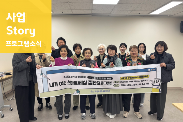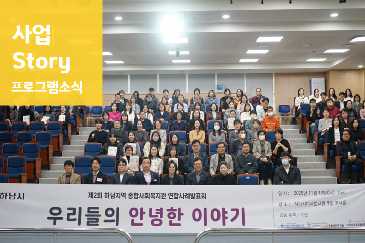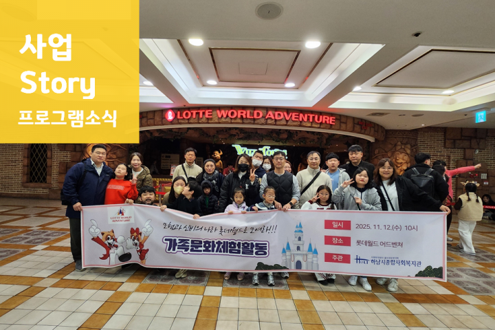2025 가족문화체험프로그램 '롯데월드에서 모이자!' 2025-11-25 조회수 386 하남시종합사회복지관 찾아가는 주민교육 프로그램 '성장하남' 진행(11월) 2025-11-21 조회수 329 2025년 내가 여는 스마트세상 집단프로그램 진행 2025-11-14 조회수 416 2025년 사람과 사람 사이를 잇다 ‘사이사이’ 가을 나들이 2025-11-14 조회수 503 2025년 하남시 3개 종합사회복지관 <우리들의 안녕한 이야기> 연합사례 2025-11-14 조회수 606 2025 장애인평생학습도시 '힐링공방' 2025-11-13 조회수 254 2025년 아동권리 증진 사업 '오늘은 노는 날!' - 신도심 2025-11-12 조회수 300 "AP NOW! 적극적 부모역할훈련" 부모교육 2기 2025-11-11 조회수 519 2025 장애인평생학습도시 '슬기로운 요리생활' 2025-11-10 조회수 267